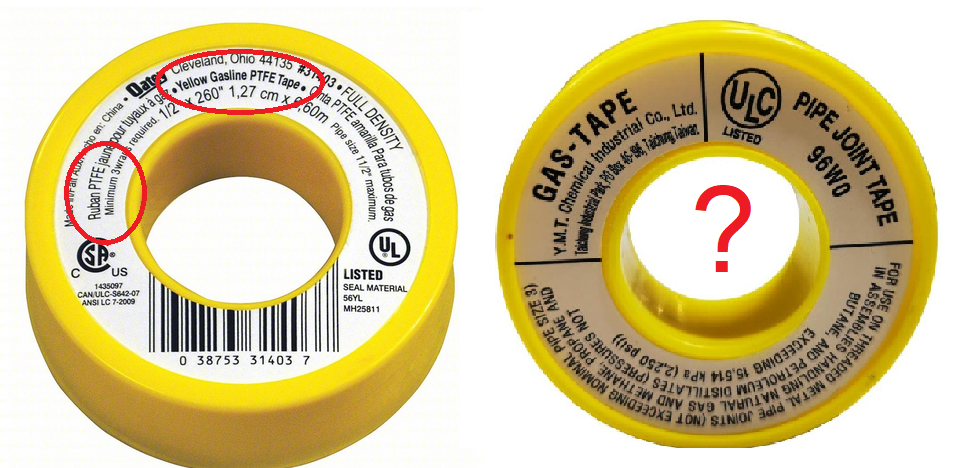 I agree that PTFE tape can be used for gasoline. BUT I don't trust the color of the tape to indicate its overall use (too much stuff made overseas :cry: ) prefer that it states what its made of Material Polytetrafluoroethylene or just PTFE