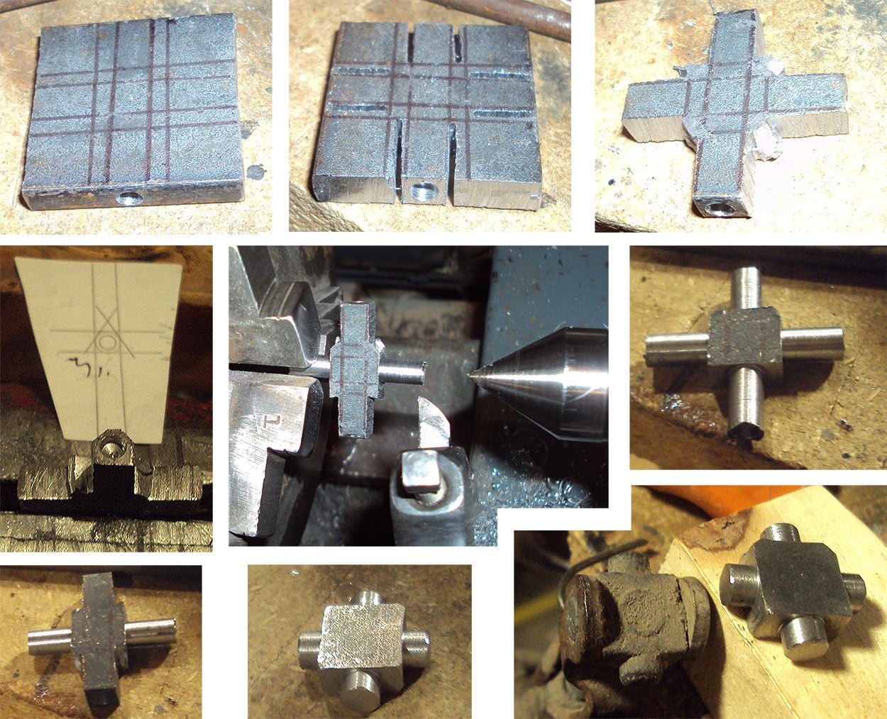 Today I finished up a mixture control project. Reaching under the dash is a bit of a stretch and a little distracting to my driving. It also alarms new passengers. I recall some accessories made for this but making my own version was fun. Copying the U-joint for 1926-27 cars and the choke knob give this a look of belonging here. I had hoped to mount it below the dash but the angle was too sharp and I had to drill a hole in the dash. The first piece was the cross. It's cut from 1/4" bar. Filing 3 sides to center in the chuck as shown. Then turning the ends. Next I cut some 12 gauge for the arms. I traced the arm from a needle valve arm on one end. By pinning the two arm blanks together with a cut-off from the cross end I could use the first curve cutout as a guide for all the rest. Flipping the pieces as needed. This makes it easier to cut them the same. Tracing leaves a little extra metal to trim up any differences after bending. Also drilling the holes smaller allows filing after bending as the holes never line up perfectly. (at least for me) Silver soldering some shanks and drilling them for the rods was the next step. If you are like me tapping #6-32 holes is as scary as driving a T on the freeway. I don't mind buying new taps but a broken one sure ruins the part as well as the day. No problems this time fortunately. Is it poetic justice to make the knob out of an old T axle shaft? It sure machined nicely and wasn't hardened in this area. The new parts looked nice but I had to take the shine off them with some heat and mud to match the rest of the car. It turns a little stiffly but that will help keep it from turning by itself. The adjusting needle nut is about worn out. All the materials were leftovers from other projects. The 3/16" rods are from a coil of welding rod that was scraped years ago. I've used a dozen feet so far and a hundred or so to go. It requires some straightening but has light rust and doesn't need further de-finishing. This was a satisfying project and it's nice to be making some parts now that the lawn it caught up with.