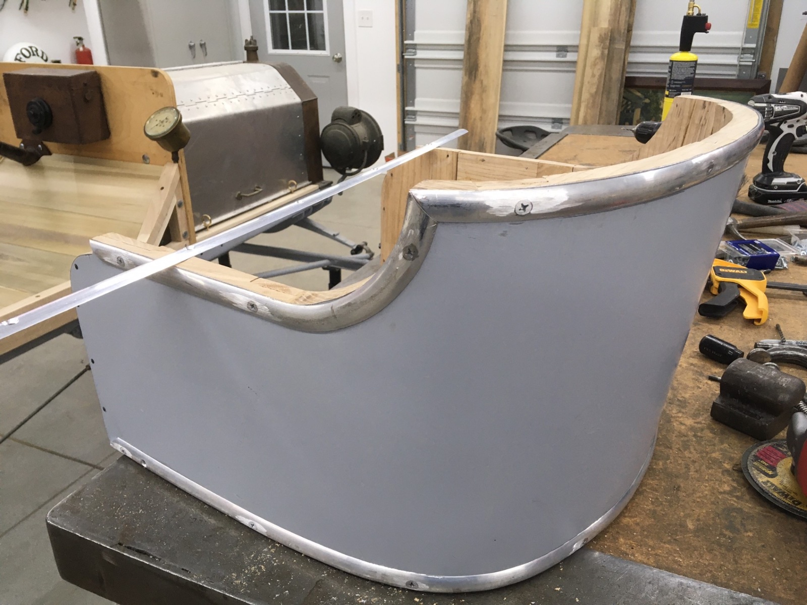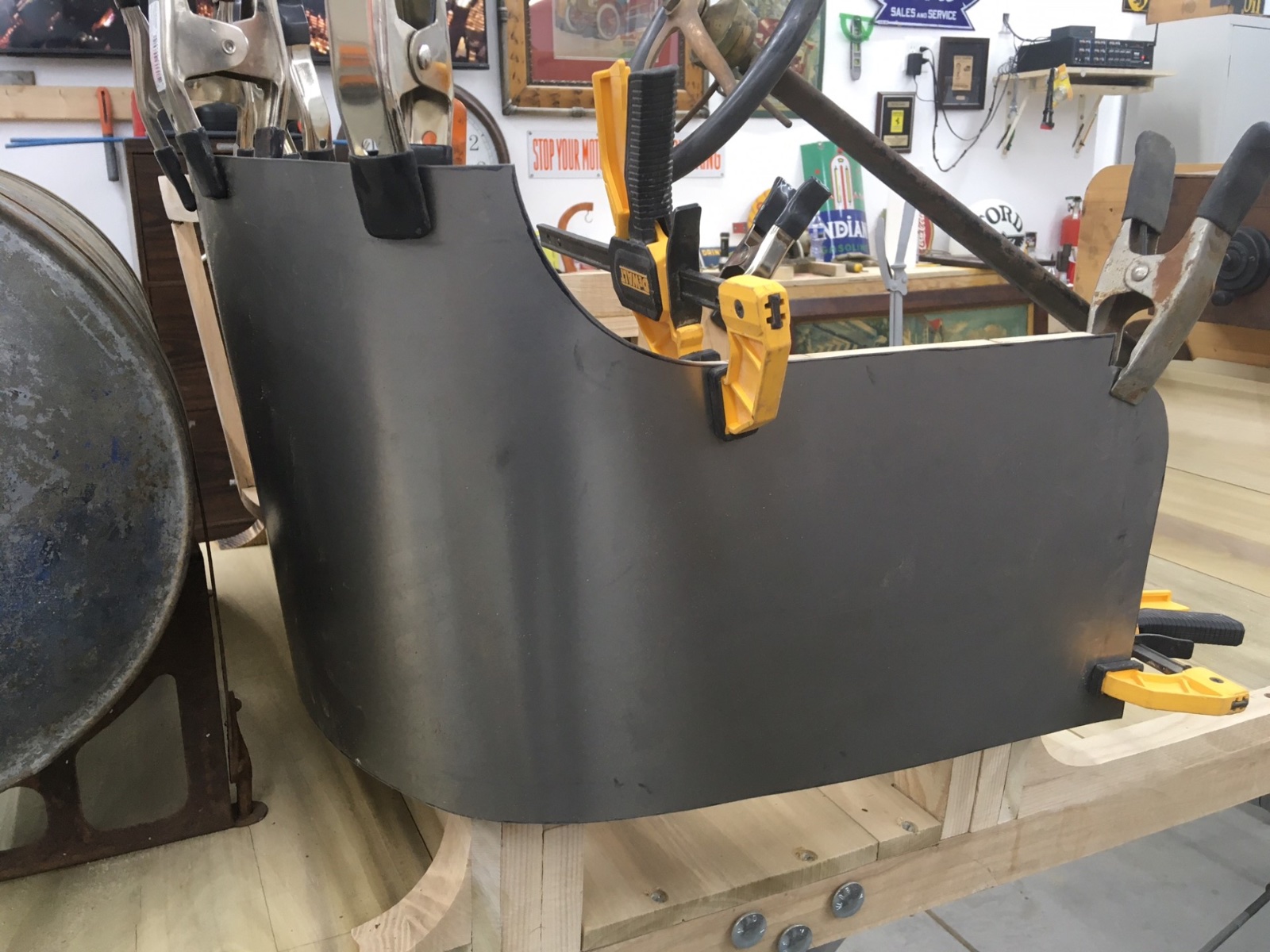 I had to bend aluminium moldings for my 1912 van and my 1925 wide body roadster, and used a wooden former like yours for each, but with a slight difference in technique. I cut the formers to the OUTSIDE diameter of the curve needed. Then I used my table saw to cut a grove around the curve. The cut was set to the depth of the molding width. I had to do two cuts side by side to get the groove as wide as the molding was thick.