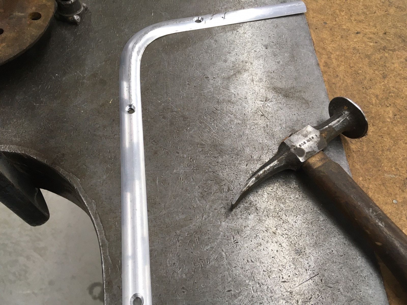 Since I don’t have a 8’ brake at home, I sandwich a 1” flange between two 3/16” strips and knock down with a rawhide hammer, checking to see it is approx. 7 degrees short of 90.