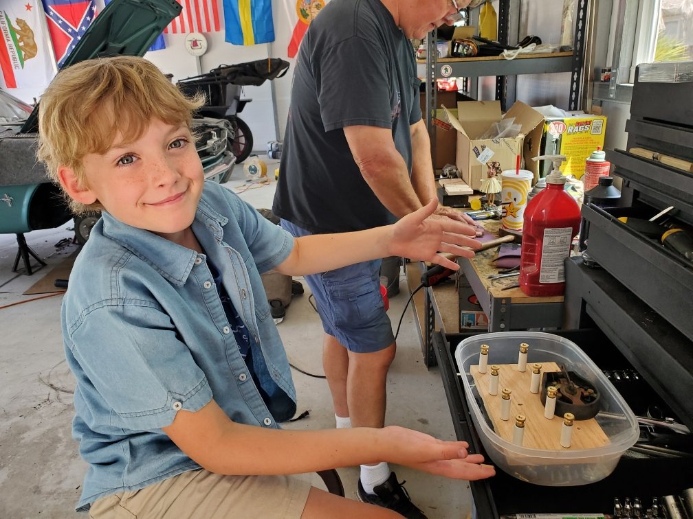 While in great overall shape, I'm full on tinkering in the shop. Having been fortunate to learn my skills at a young age, I am blessed that the eldest of our 4 has shown an interest. Here he is showing off his handiwork after I instructed him how to put together the contact panel for the coil box....