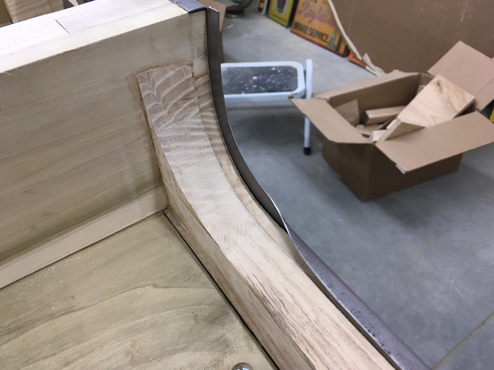 I had to bend aluminium moldings for my 1912 van and my 1925 wide body roadster, and used a wooden former like yours for each, but with a slight difference in technique. I cut the formers to the OUTSIDE diameter of the curve needed. Then I used my table saw to cut a grove around the curve. The cut was set to the depth of the molding width. I had to do two cuts side by side to get the groove as wide as the molding was thick.