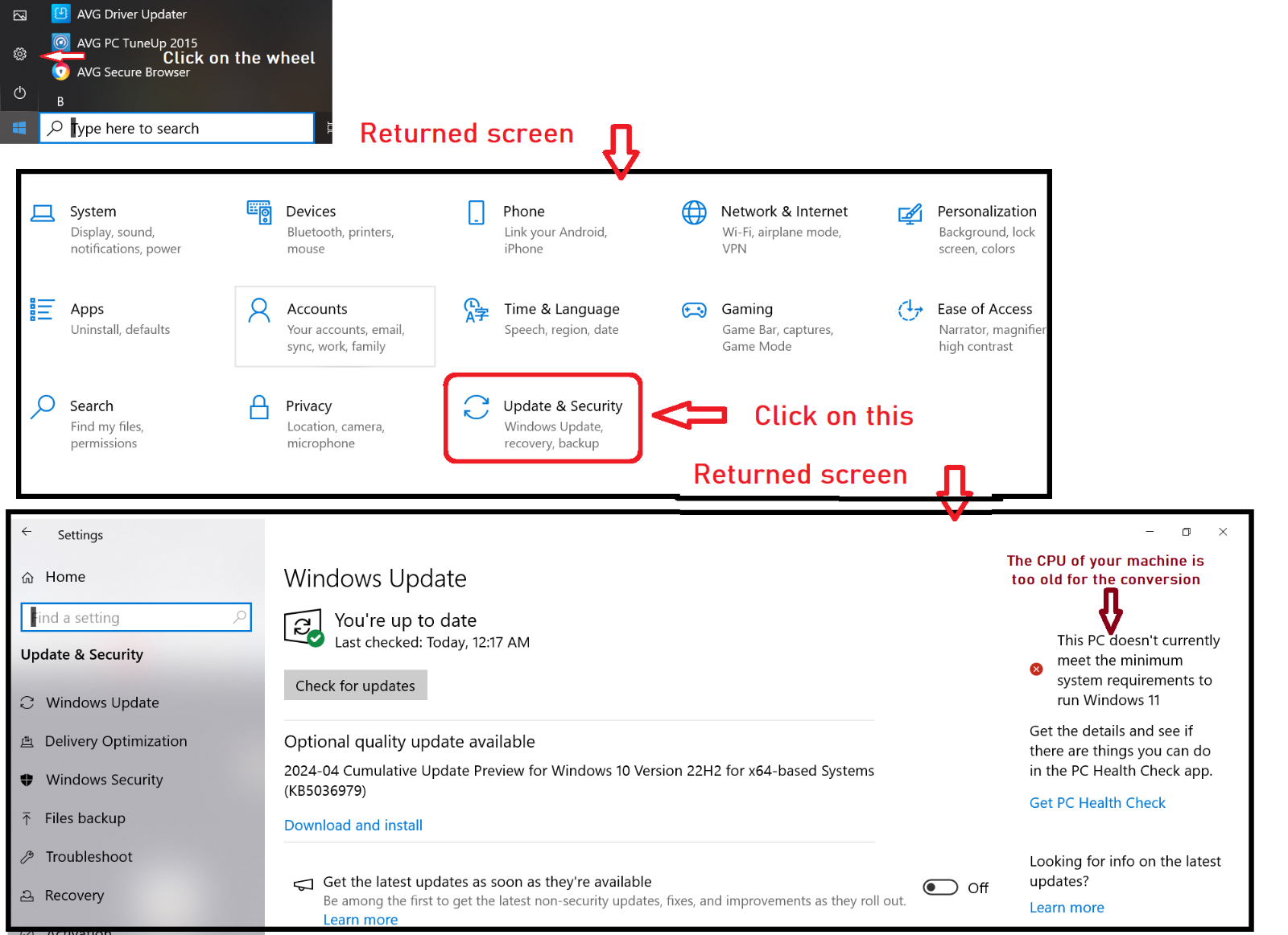 Not sure what "Windows Update" you are referring to for a 12 year old computer. Mentioning the time frame - " Microsoft ended the loophole that still allowed for free upgrades to Windows 10 from Windows 7 and 8 in September of 2023". Having said that, if you converted to Windows 10 earlier than that (was available in July 2015 for free) there have be numerous updates ever since. You (or your Daughter) can check to see if your current by clicking on the wheel icon in the lower left corner of you screen (if you don't see it then click on the windows icon key on your key board the four whit rectangles in a perspective)John Codman wrote: ↑Mon May 06, 2024 1:40 pm