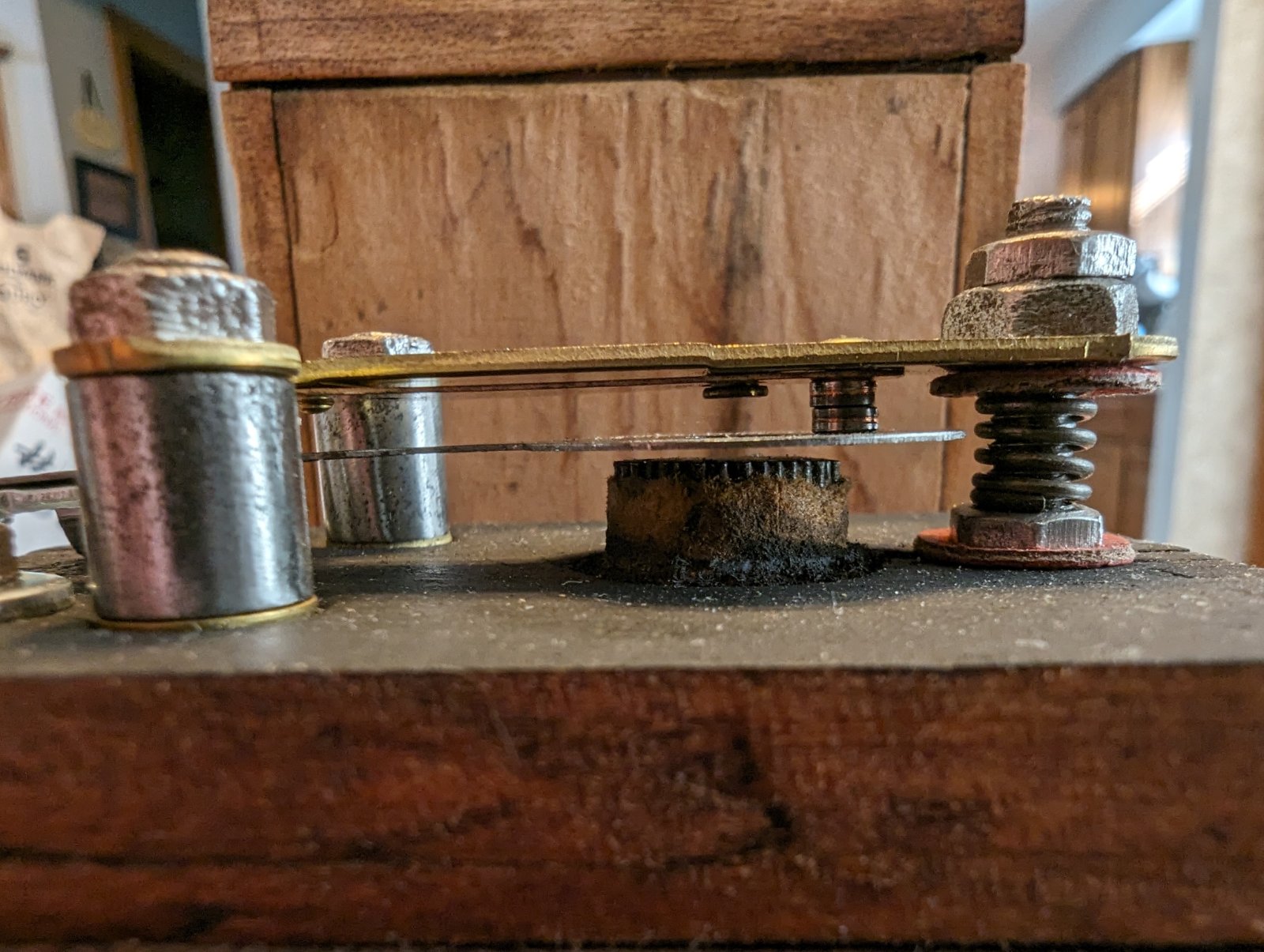 K - W style coils...... Refurbishing ignition coils is more than just replacing the top hardware. Hopefully by this point you have checked the capacitor, and or replaced the capacitor, checked the secondary coils for 3200 ohms, besides cleaning and polishing the three coil contacts that connect to the coil box..... The current run of KW coil points are a lot better than past production. The cushion spring has been more closely adjusted to average 0.010" clearance. Tension on the vibrator point and the cushion spring tension would have to be adjusted for electrical values..... Save your upper bridge coil points, you can snip off the attachment and use those as washers underneath the standoffs to compensate for wood compression so the new bridge will horizontally run parallel with the top of the wood coil case. Depending on past tightness, wood dehydration, or physical injury, ... two washers may be needed. After wire brushing your standoffs and post nuts install your new coil point set and be sure to have the points mate in exact mating position ...... Using your hand crank coil tester, achieve single spark and 1.3 amperage readings.