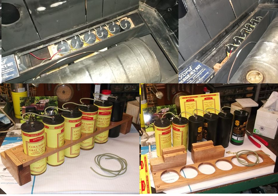 Here are pictures of what I came up with for a vintage battery for my 1913 Runabout. This is based on what I read about the earlier Ford's , Model N , etc. The wiring diagram I found for the Model N shows two battery's in rows of six. It was not until Henry designed the Model T that we get the flywheel magneto. From the booklet or operator's manual that was written in the fall of 1913, it only mentions that a provision is made for a battery. That provision being , a switch on the coil box. I have a Beaudette body and behind the gas tank is a long narrow compartment that I use for a battery and other stuff. This seemed perfect for the six battery cells and I decided to build a rack to hold them. The rack is not necessary as a board placed behind them would have done the job. I personally believe that when the Model T's first made it out to the Agencies, they installed a battery. No free starts with out a battery. The 1 1/2 volt battery's I used have the look and voltage of the old dry cells but are constructed much different. The originals would have been metal cased with a carbon anode in an electrolyte. These are simply a plastic casing with up to date battery's housed inside. When the battery's have used up there life, I will leave them for display