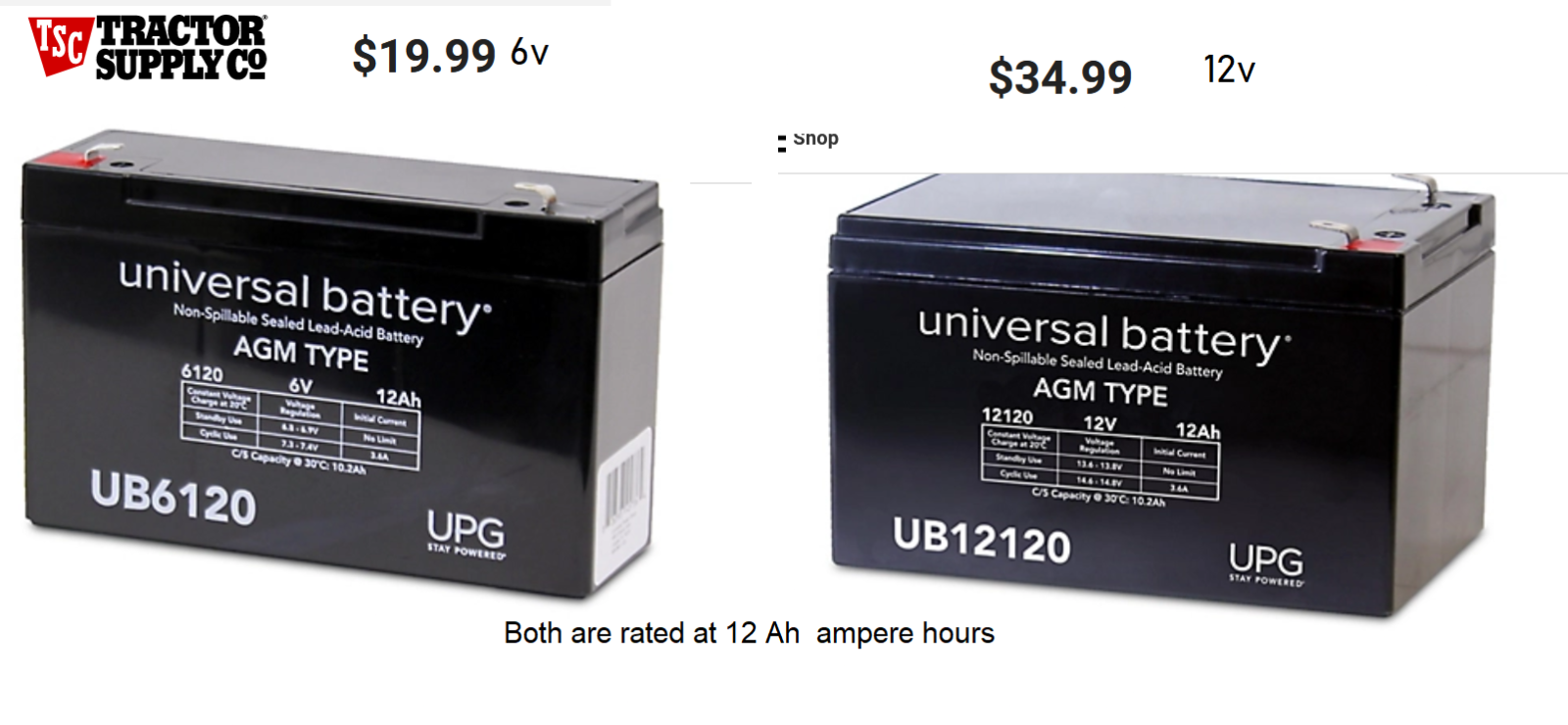 This 6v is a similar battery as above, and often sold as a trolling battery. They are AGM batteries so they can be mounted on their side or upright & designed for recharging. 12Ah, ampere hours which is much more than many others.