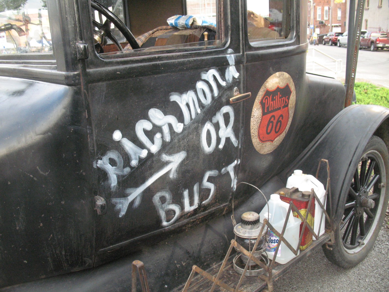 This is the first time I am able to get back to post here since we are now at home. We had a great time driving all around Richmond and getting to meet some old friends from the forum and a few new ones. This year we brought the new car which was running real good and made it to Dayton without issue so the drive back to Richmond looked like another easy run till we got just about 1/2 block from the Lowes on 40 at Eaton Pike near Richmond where the car suddenly lost power and made some strange and nasty sounds so I started looking for a place to pull off and shut it down and coasted into an opening to a gravel lot. Several people stopped to help and after checking things over we checked the oil and the top petcock had vibrated open some time along the last 50 miles because of a weak spring so no oil in that one so I checked the lower and oil did run out so at least it had some in it. I had 3 quarts under the seat and was able to dump in all 3 and still nothing dripped so someone passed me another bottle and after about half a quart the oil started to run out so I closed it and spun the engine over a few times to see if we could hear or feel anything. A quick start up produced a knock that said the tour was over for me and my wife. Since this tour had no vulture wagon it was up to anyone willing to help bail us out. A big thank you goes to Tim Wren who stepped up and offered to take me back to the campground where our trailer was parked. The ride was nice in spite of the reason and Tim is a real asset to the club in many ways but he went above and beyond to help as did many others and I owe them all a big thank you as well. Now the work begins and we will see what damage is done. The up side of this is that the engine had been replaced with a 16 block at some time in the past so this wont be as bad as it could have been if it had been the open valve 1909 engine it started life with.