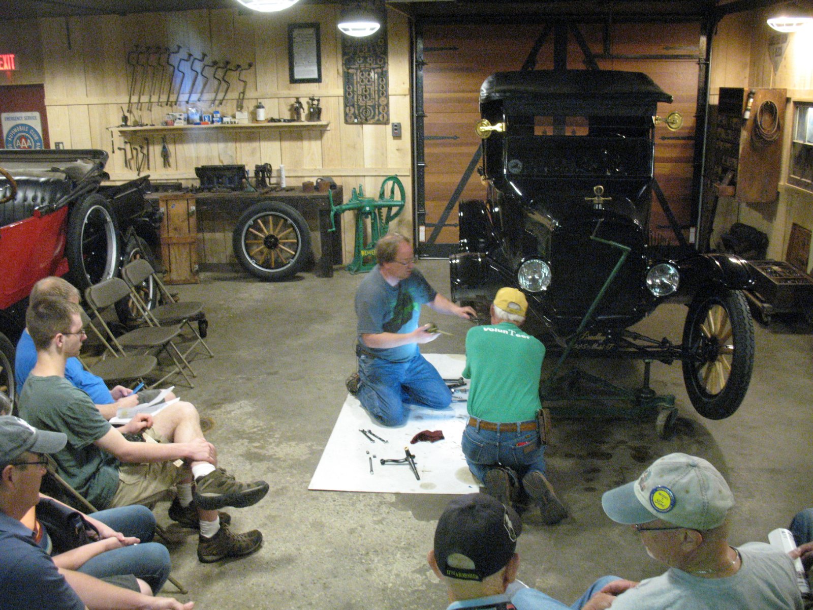 Elizabeth Estep (second from left) and Mike Francis (back to camera) were on hand to show their work on a 1923 touring. Mike makes the tops and upholstery and Elizabeth installs them.
