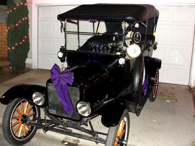Hang some spooky garland and put in a couple of strings of battery led lights and invite everyone who comes by (young or old) to sit in the car and have their picture taken, whilst I pass out candy to everybody (including the parents) and wish them Happy New Year (don't ask why) which makes them laugh whilst equally looking puzzled. It's always the biggest hit on the block and even out does the more extravagant and costly displays in the neighborhood, nothing can beat a Model T for showing off.