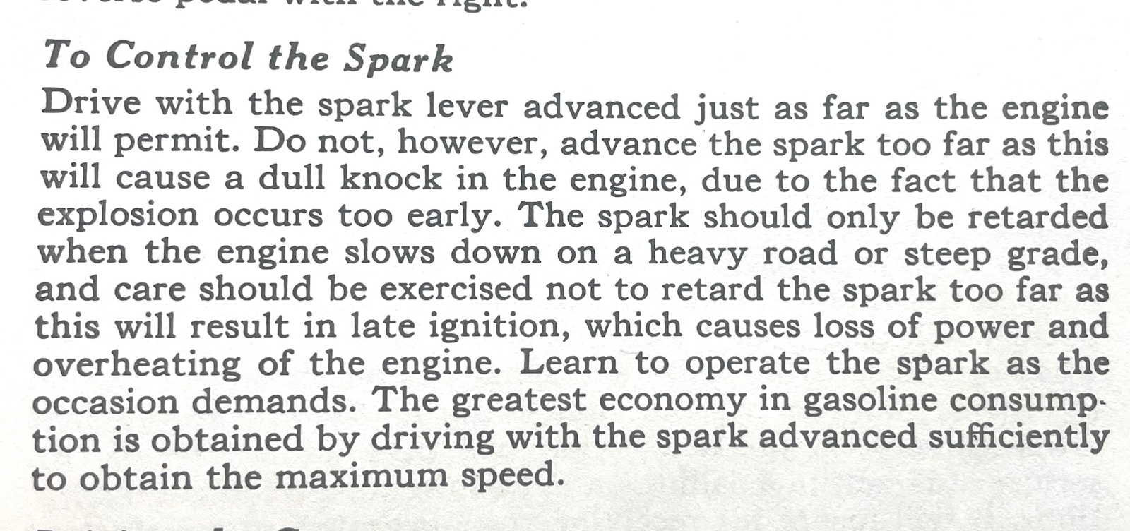 Again, it's engine speed and load that determines the right spark setting at any given time. With today's gasoline, you won't likely hear any knock or ping, even with the spark over-advanced for the situation. Timing that is advanced too far is hard on the engine and reduces power. Timing that is late reduces power and increases heat. Ford put the spark control at the driver's fingertips for a reason. Under most riving conditions, it needs adjustment to meet changing conditions of speed and load, much as the throttle does. With a little practice and understanding of what the engine needs, adjusting the spark lever can be as automatic for the driver as adjusting the throttle lever is.