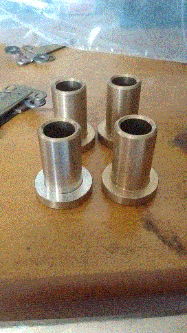 The place to take care is the diameter of the bushing. The ones I buy are .690" which would be marginally OK on the snug side of a .6875 hole. Unfortunately, the spindle holes are quite often well undersize and there is risk of splitting them, particularly early spindles. I just did a set for an '11 and the spindle holes were .678". There is no way a 12 thou oversize bushing would go in (I wouldn't even try), so had to turn them down to fit. Here is one of 4 ready for fitting...you can't hardly tell the difference, but the spindle sure did (and it appreciated not being swelled to the point of exploding).