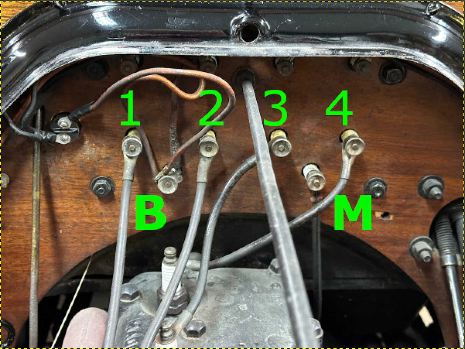B is the terminal fed by the wire from the battery. You also see a wire from there to the headlight switch (left side of the picture). At the top, almost hidden by the hood former is where the timer wires are attached. The timer is a switch that fires each of the coils in 1, 2, 4, 3 order.