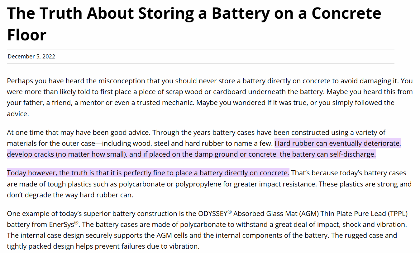 Leaving an auto battery on a concrete floor has been a no-no as long as I remember. Maybe there is an explanation for it. I always try to charge a battery in the car or if it’s taken out I put it on a board or a or some where that’s not touching the concrete floor. You won’t see batteries on the floor at parts stores or farm stores but off the floor in a rack or shelving. Or at least the ones I go to.