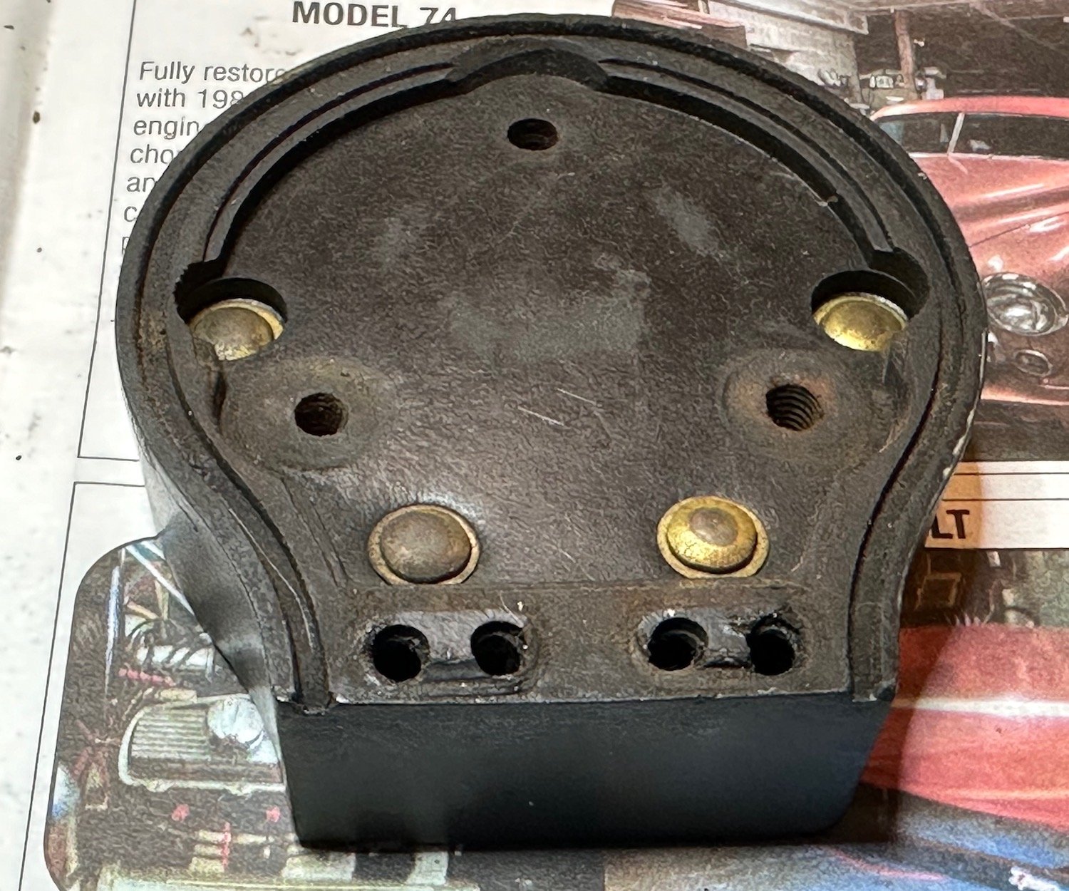 With extremely judicious use of these products and an extremely gentle approach to the repairs it will be usable far into the future. Apply the tiniest amount of glue and wipe off any excess and plug the holes with something to ensure no glue makes it into the threads. Let it sit overnight. Use less than a drop of oil on the rotating assembly with a probe and wipe it off thoroughly after some rotation either way. Polish the brass face and use just a thin strip of emery cloth to polish the inside of the folded contacts. Swab with alcohol or other cleaner that leaves no residue. Put the tiniest drop of grease on the slider and wipe off any excess. The new paper gasket will likely benefit from some light sanding with an emory board as any ill fitment could crack the covers when tightened. Double check that the wire cover is intact and no contact is being made where there’s rubbing. Clean the threaded inserts with a swab and some penetrating oil and remove any excess. Remove, clean and re-tighten to snug all the fasteners and then “send it”. Any disagreements with this advise or more specific treatment would be most educational as I’ve never actually owned a coil box switch like this. Just basic service methods for continued use of any mechanism of its age as I learned it, hope this helps. -Chris in Boulder