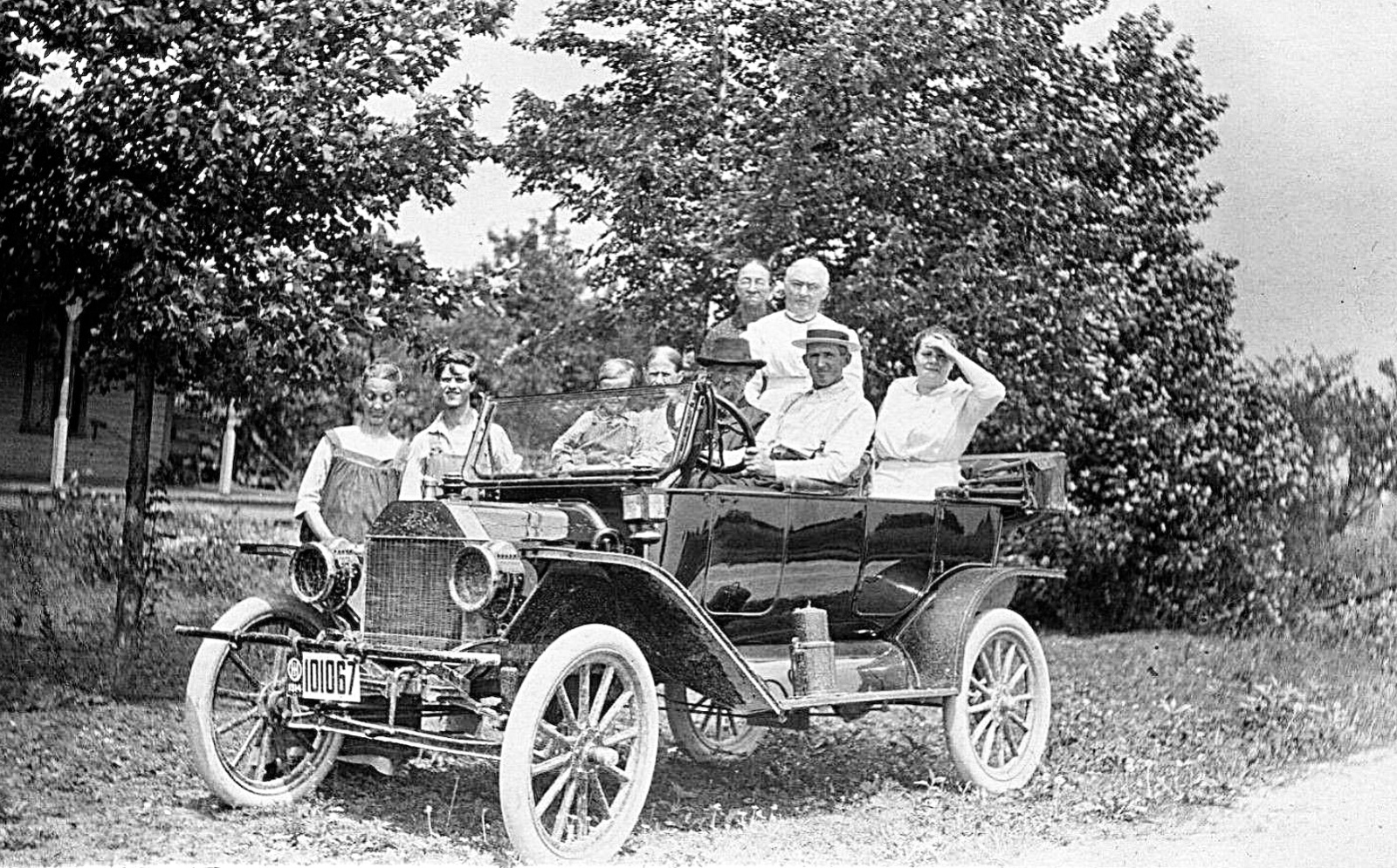 Number ten. A 1917 mid model year based upon radiator and fenders with the even folding windshield. Whiteish sidewalls on tires can be seen. Front tires appear to be smooth, no tread. Rears I can't be sure about the tread or not.