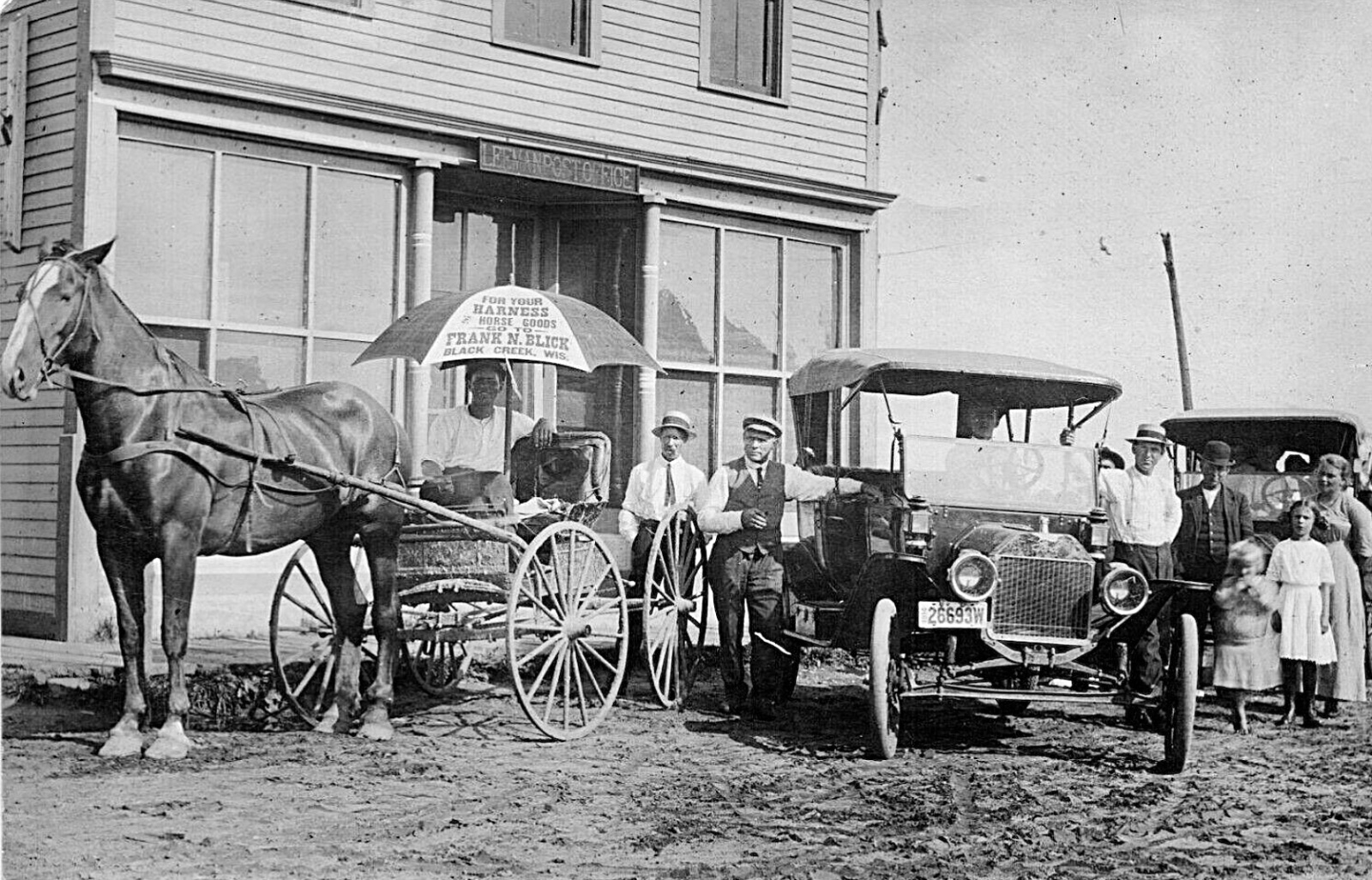 Number eleven. I wonder what is going on here? Interesting looks on people's faces. 1914 touring car, another Ford behind it. Another set of those bad shock absorber on that T. Good looking horse pulling the carriage with advertising on the umbrella. I wonder if that is the harness maker in the carriage?