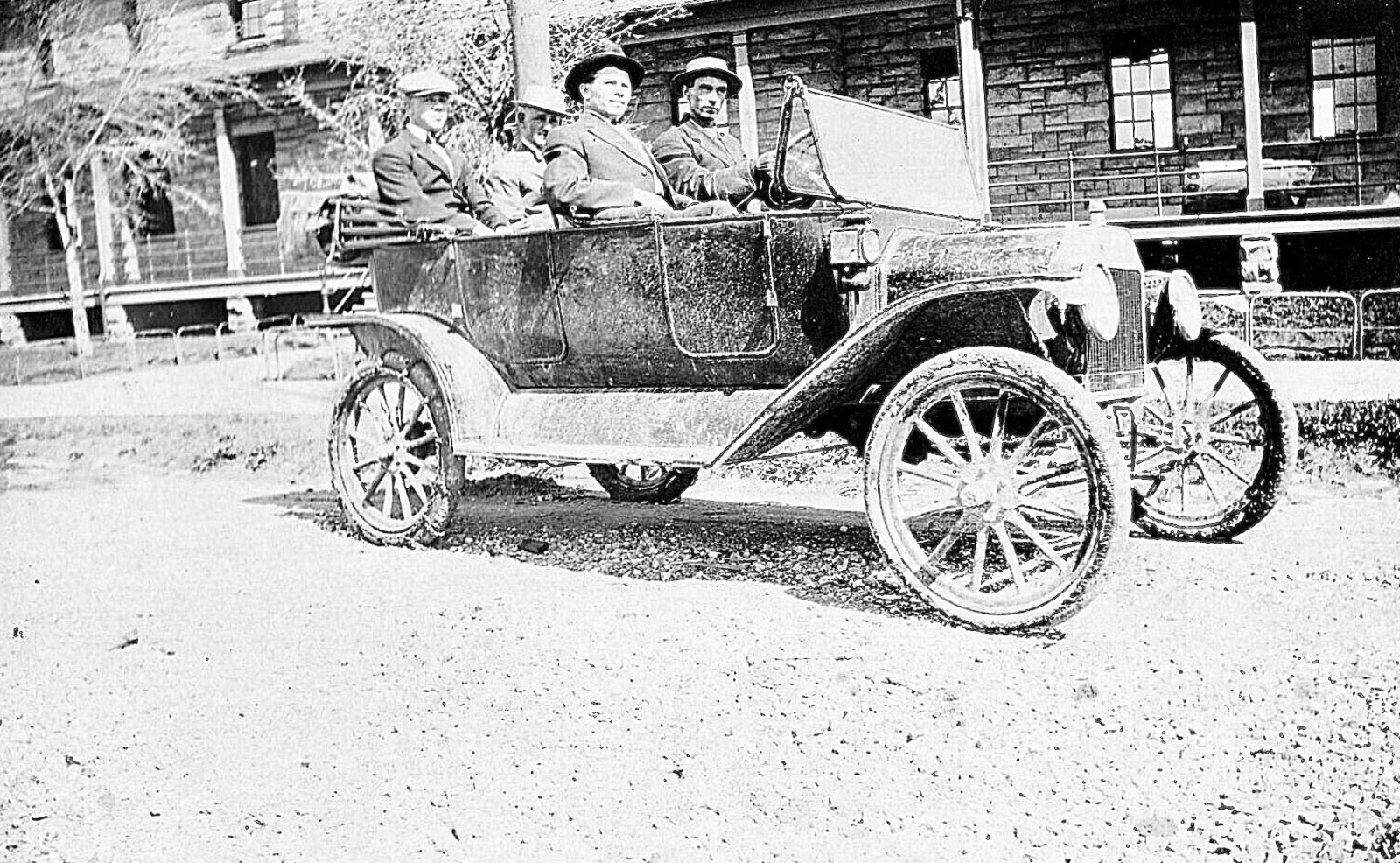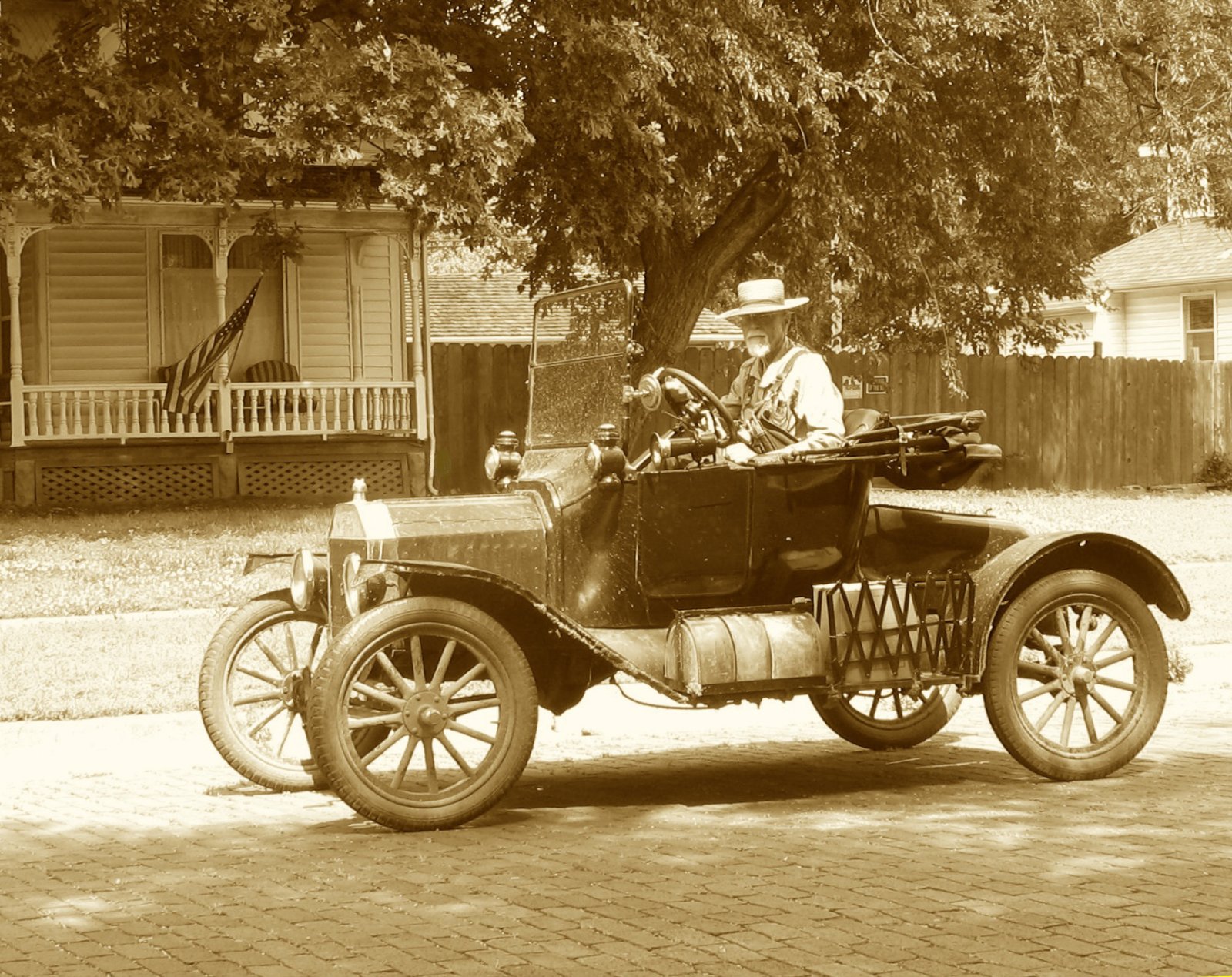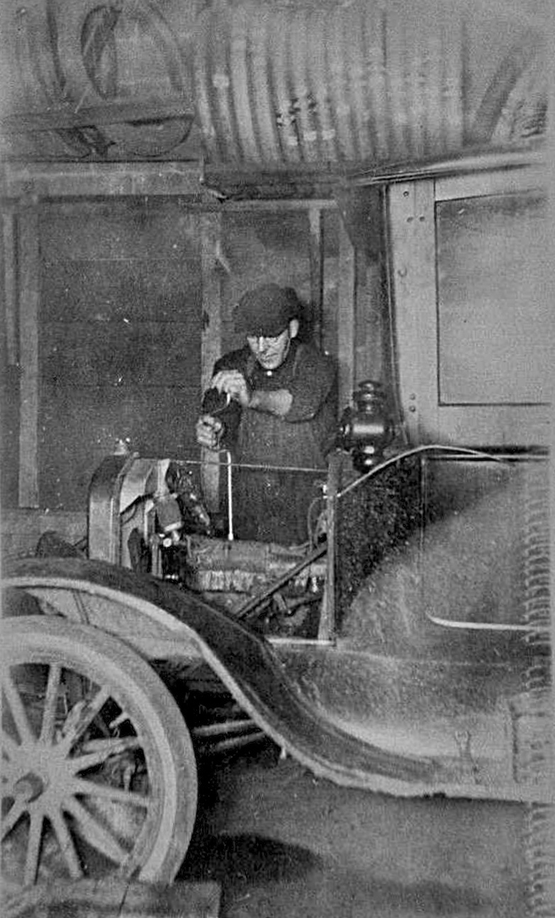 What a cobbled up mess of a car! But still doing the job. 1915/'16 firewall/hood former, 1917 or later radiator, I think an electric horn button although I can't see the horn on the other side of the engine? Left headlamp is twisted or bent back, although the left fender appears to be there. Right headlamp is a gutted bucket, but appears to be straight.