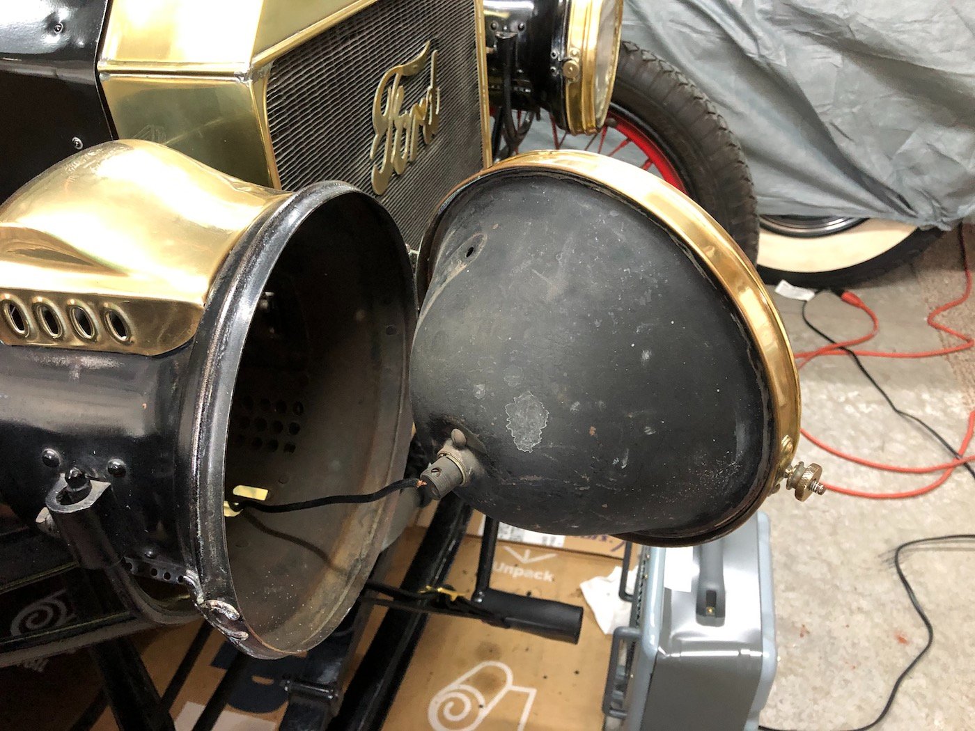 Speedy T identified the internal parts of the headlights as later T buckets squeezed into the old brass bezels. It might be a fun job to replace the bulbs. The switch was not working very well and I replaced it with a repop '15 switch which fit the mounting holes perfectly. Whoever originally electrified this car may well have just used later Ford parts.