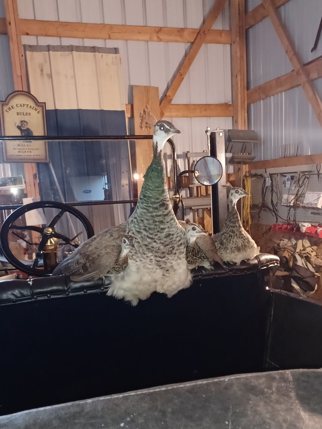 Fast forward 3 hours later, haven't seen the Peafowl. Locked up barn but I needed to go to the workbench to grab my volt tester. It was fairly dark in there and as I got close to the car I heard this noise. Mommy was clucking at me! Scared the crap out of me! Here it seems they sought shelter from the hawk. Look close at her wings...she's got the 2 smaller kids under them. Such a good mom. Yeh I had some cleaning to do!