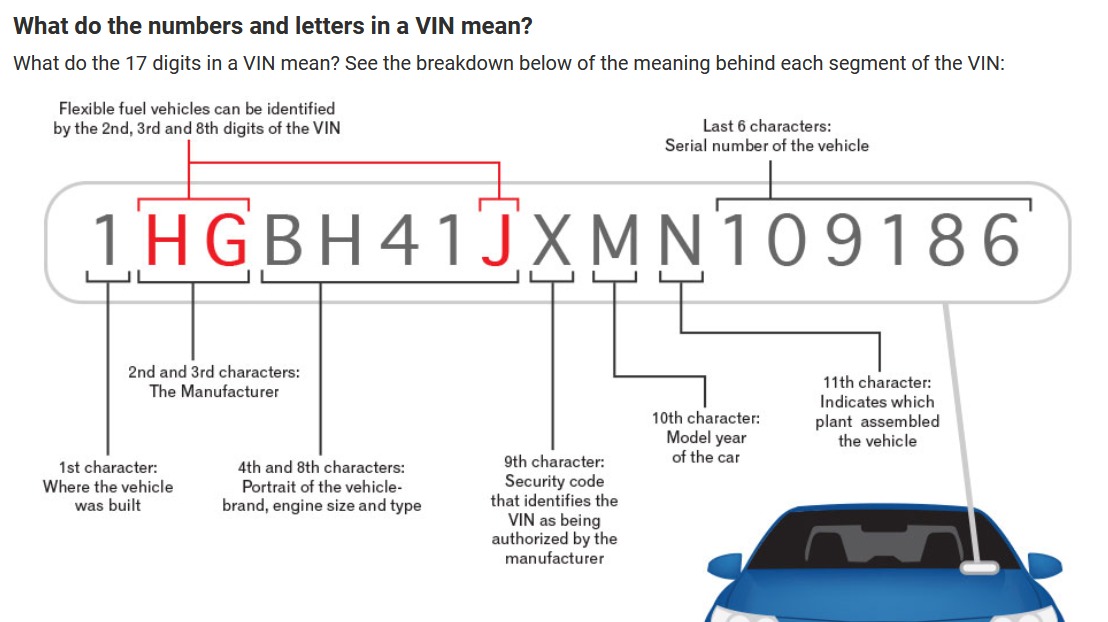 Today the VIN serves as the car's fingerprint, as no two vehicles in operation have the same VIN. A VIN is composed of 17 characters (digits and capital letters) that act as a unique identifier for the vehicle. Now if you look at your Title the values in the VIN field likely begin with just numbers.