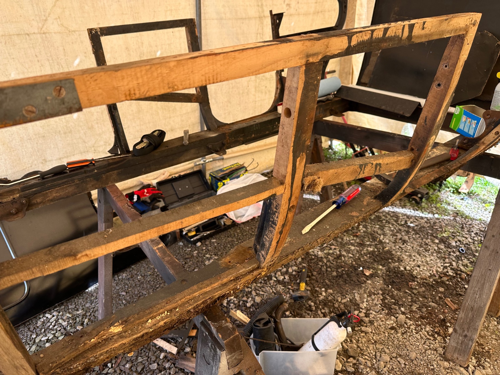 After the Ohio Jamboree, I figured I'd take a little time dealing with some rust on the windshield frame of my 25 Touring. Once the stanchions and dash panel were off, I realized this was going to be a much bigger project. I found a fair amount of dry rot in the top rail between the first two pillars on each side. The further I looked, the worse it got. The dry rot was pretty bad in both the main sills. So a simple week long project has turned into a full re-wooding project. Oh well, I'd planned on painting the car in the next couple years anyway. I guess that just got moved up too.