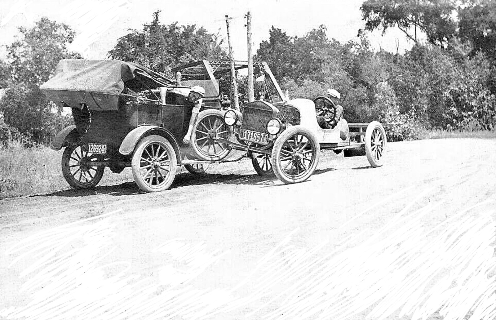 Do you suppose the speedster came from that bridge and tried to turn on the road before the other car came and then started to go over and the front wheel landed on the running board? It is possible the oncoming car couldn't stop in time and so drove right under the wheel of the speedster? I guess we will never know exactly what happened.. Very unlikely either driver is still living today.