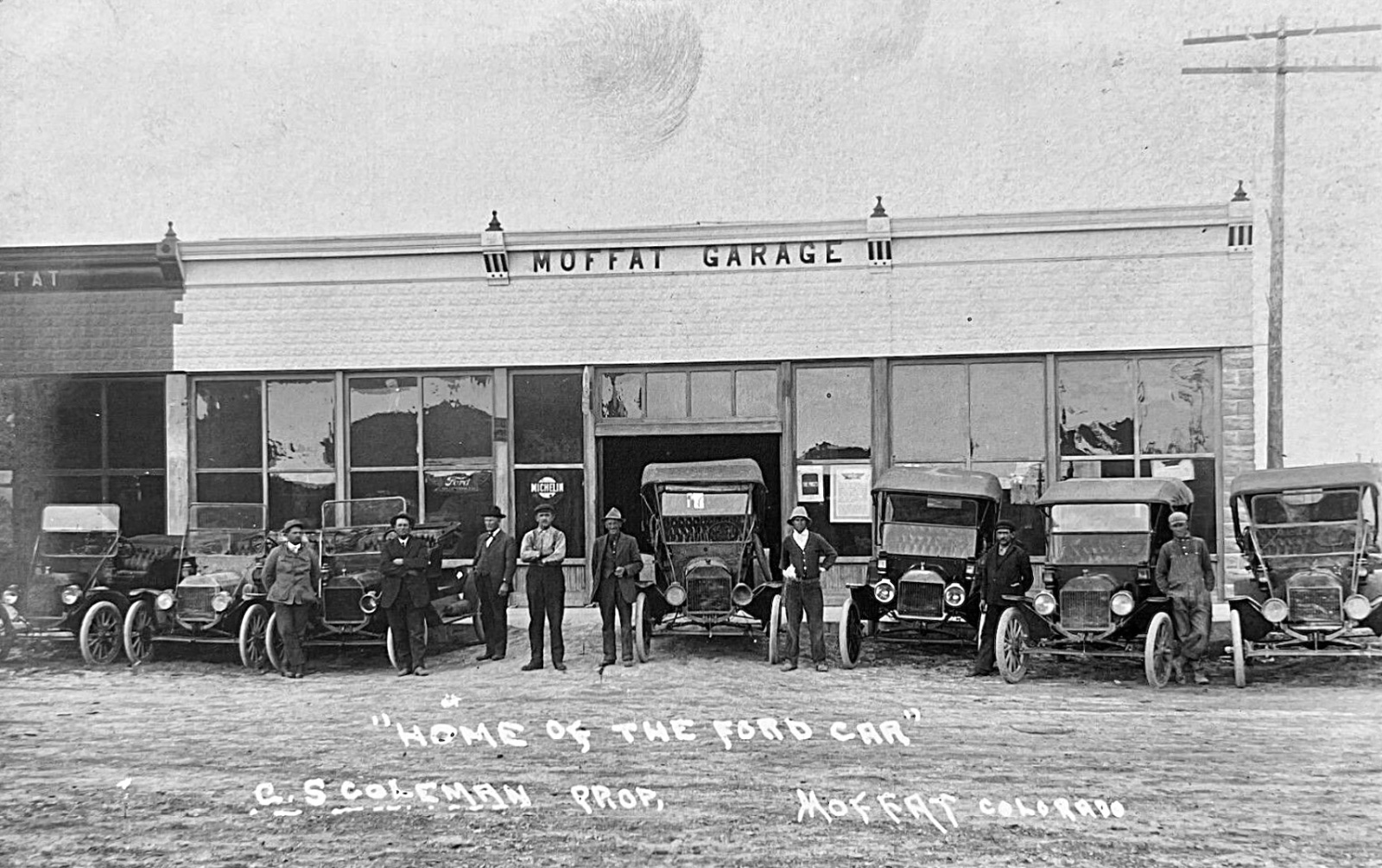 Number 9 Moffat Garage the car appear to range in vintage and age. Some look rather beaten. One might be new and about 1913 or 1914,
