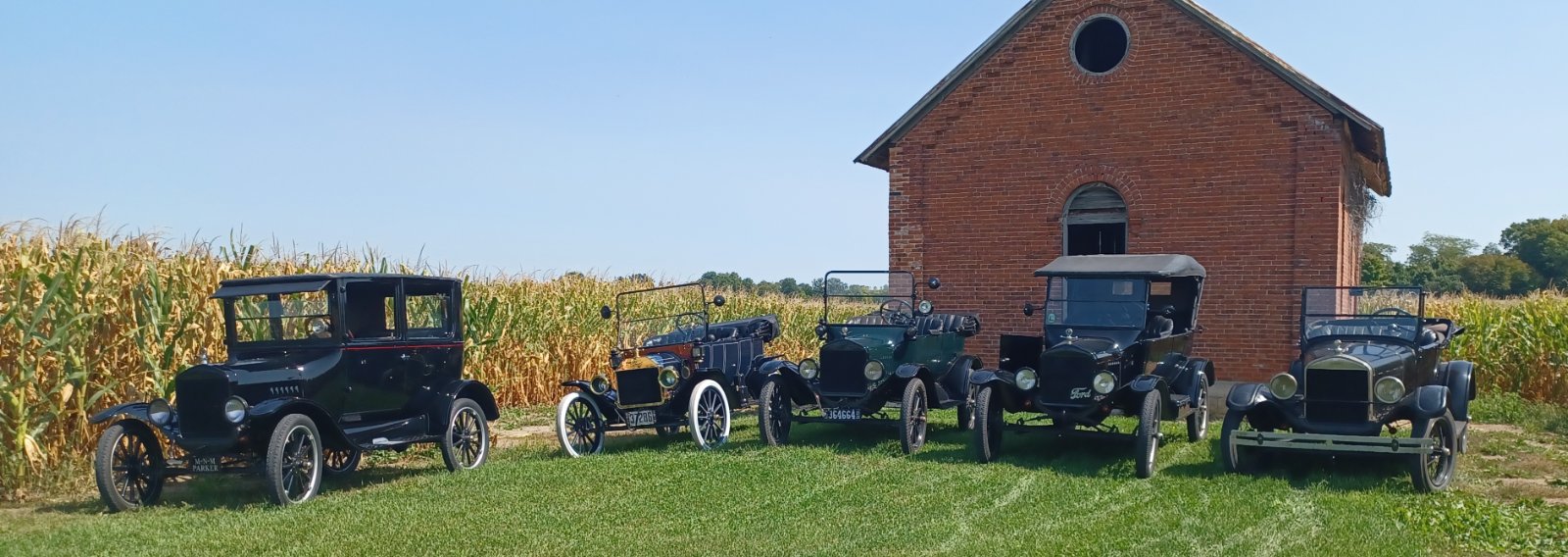 When I go out for a drive I keep an eye open for old buildings worthy of a model T portrait. I led the gang past this one room school years ago and always regretted not stopping. Today, after a nice lunch in a family owned restaurant nearby, we got our chance. And took it! Wasn't expecting the corn crowd this time but we managed! It was a super, non-muggy 80 degree day with light NE breeze. Perfect tour weather! Enjoy the pics!