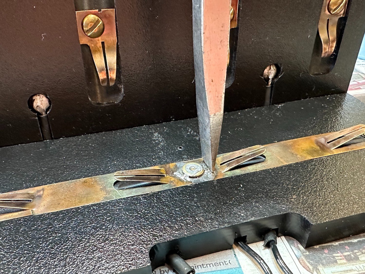 The coil box was removed and taken apart. The two end screws stood proud of the nut making the coil stick up a bit further than it needed to. The solder was removed and the whole thing reassembled. The end screws were leveled with a cutoff wheel. The whole coil box was reassembled and given a test on the bench with the meter. Pushing with the screwdriver no longer made any difference.