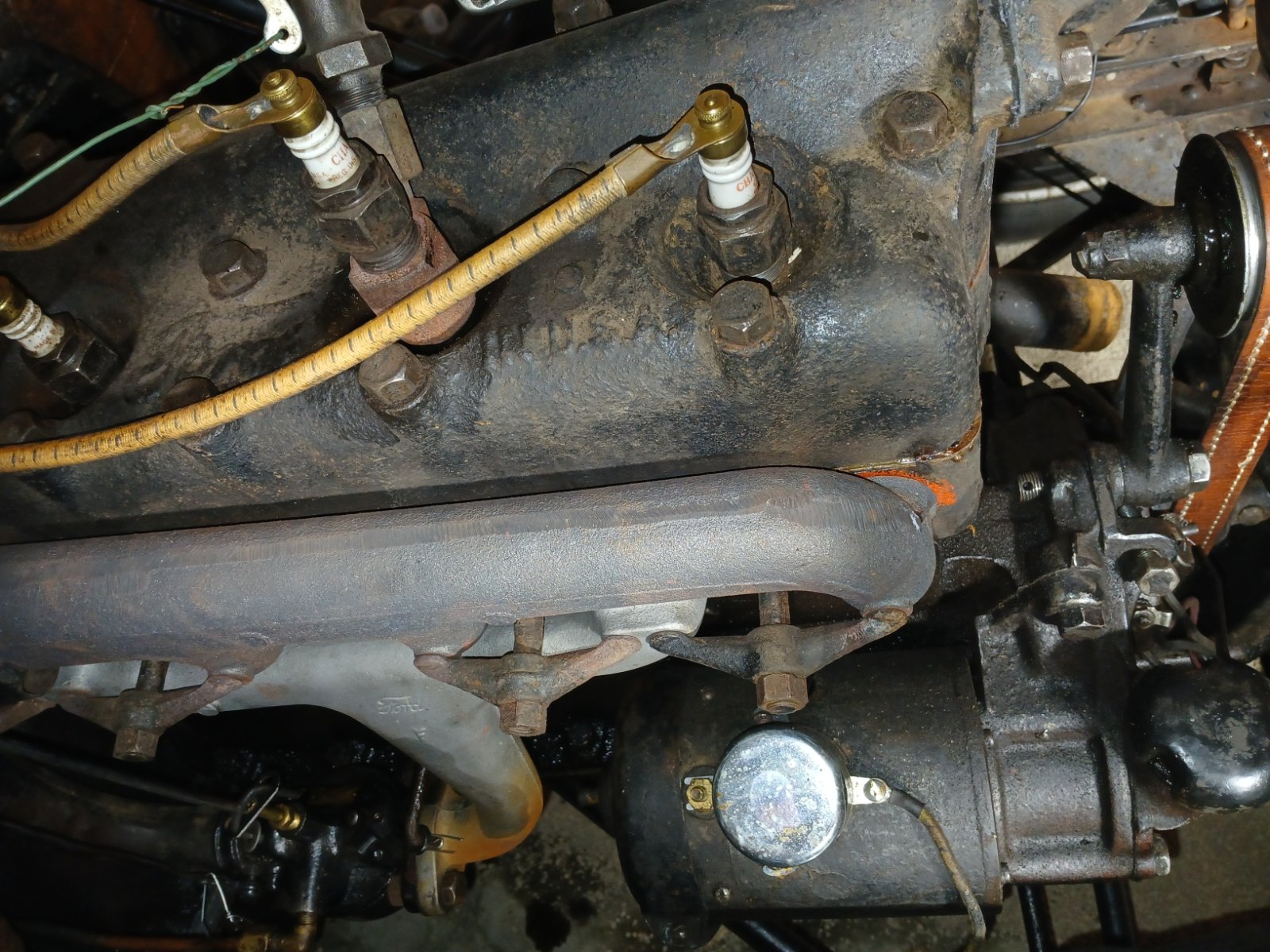 Previously we had discussed the manifold studs being too short. They were as the nuts still showed some threads well short of the end of the studs. I did an internet search looking for longer studs with fine threads on both ends. None were found! The suppliers offer some "stock" studs and I ordered a set of those. They were a trifle larger and I thought they might be an improvement. It did not prove to be the case. All of the additional length and a bit more was swallowed up when the studs seated deeper into the block. Now the nuts grab less threads than before. Look at the threads showing on the rear nut in the picture! These really need to be 1/2" longer. I may find some bolts and try replacing these studs at some future date.