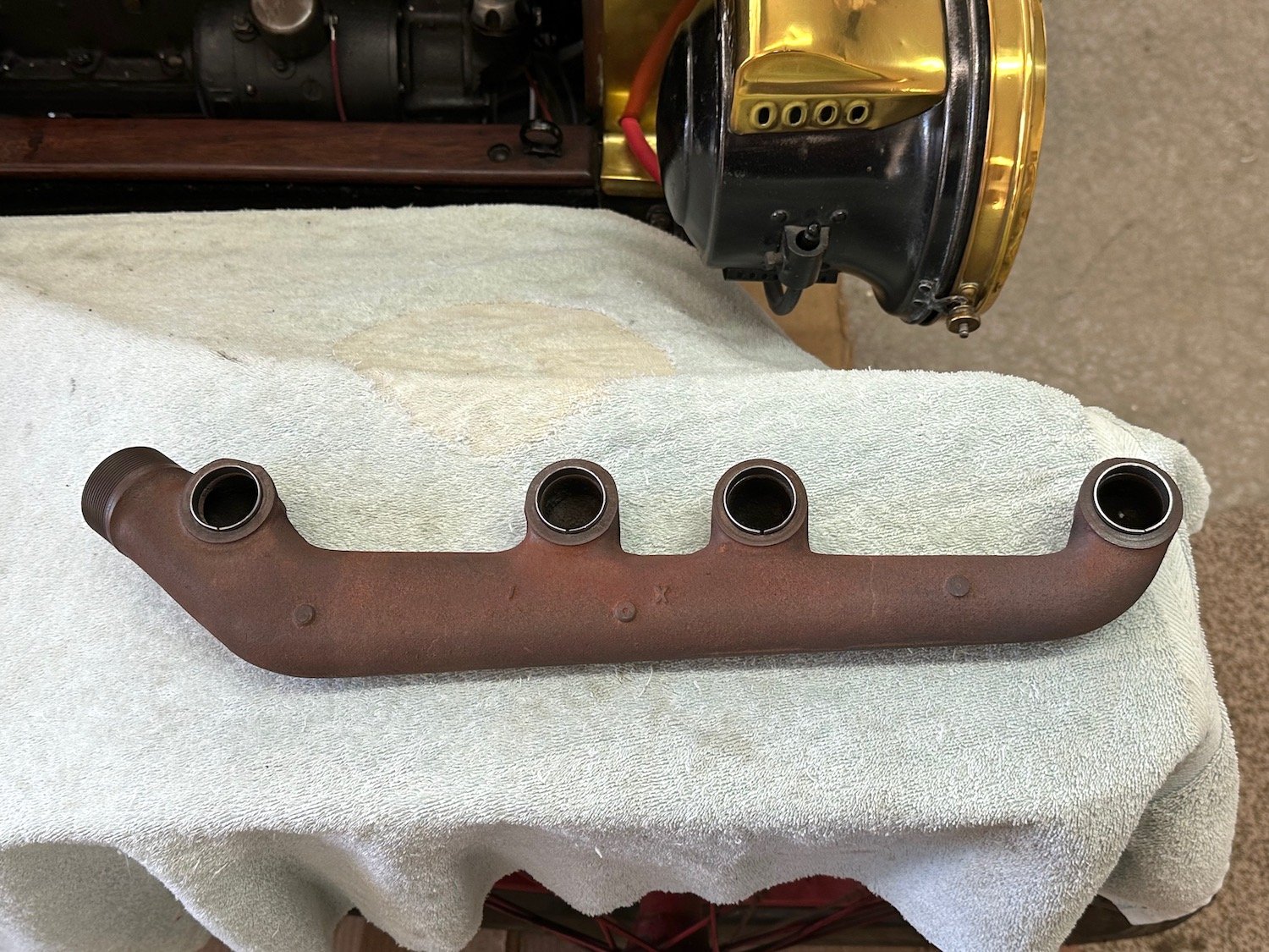 The problem came when tightening the nuts on the studs. The first three were good, the rear nut stripped the threads off the stud. All of these studs were short to my mind previously, see bottom picture to see how they were when I started. I like to see the stud sticking out past the nut, none of these did. In addition to being short, the stud in back had been cut at the factory at an angle so in addition to being short it had a partial amount of threads on the all important end. This morning I measured the studs, that back one was the shortest of the four.