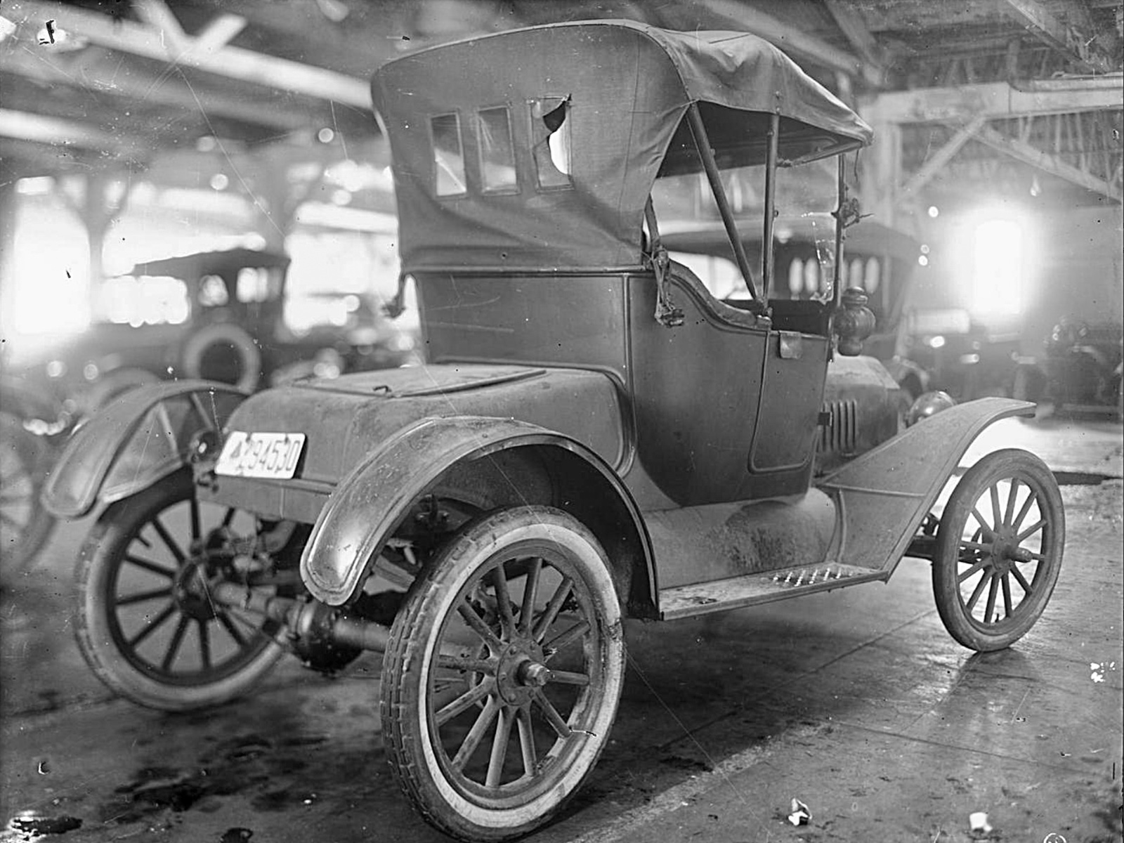 It appears to be a fairly early (maybe?) 1915 runabout, photo probably taken in 1918 as indicated by the "bell" on the California license plate. The car is showing its age already, pretty normal for the era. The top has been replaced with a later 1917 style top covering, can't tell if the sockets are original or replacements.
