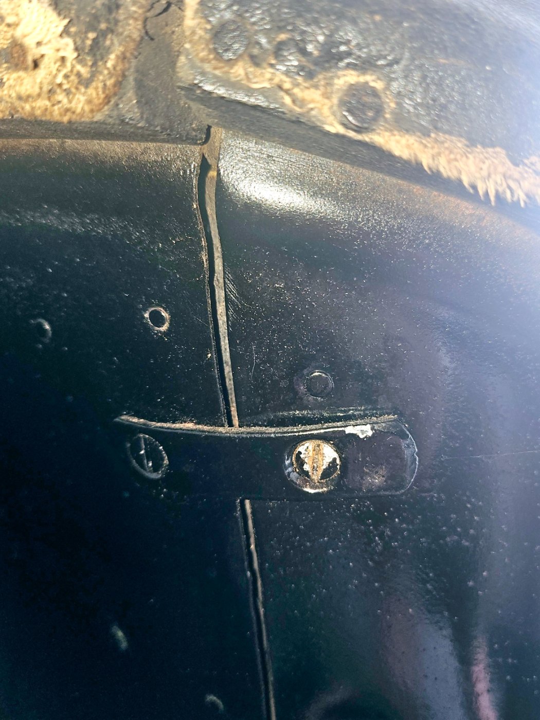To recline, you simply remove the outer facing attachment screw on the upper tabs to release. On the rear, there was a bracket attached to the body along the door where you re-screwed the upper seat brackets to hold it in place. In these pics you can see where they were placed...but...no longer attached. The guy I bought it from said they were simply wood blocks screwed into the frame, but his Dad removed/never replaced when he started the restoration in the 60's. The door panels were replaced, but everything else is original.
