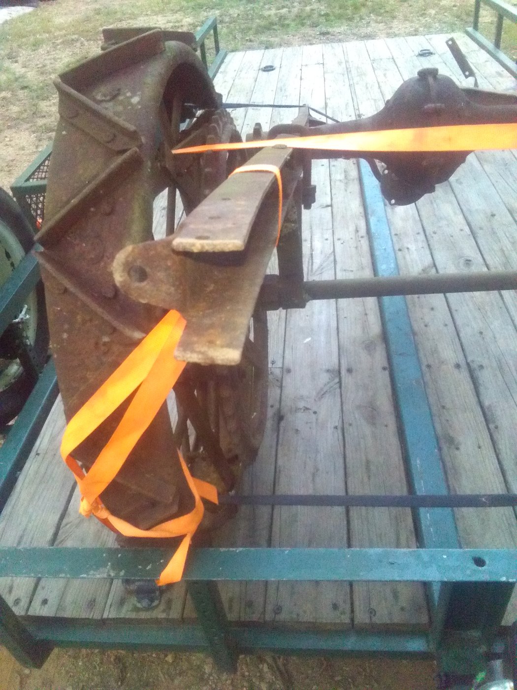 I went and got this today,not worth 2 cent money wise but I think it is a great example of American ingenuity when it came time someone needed a tractor. When I first saw it a couple months ago I thought it might be a factory made kit but it is home bullt using horse drawn manure spreader wheels and gears and chains. Bill Irwin didn't have the chains handy ,they were somewhere else but he will get them to me if he is able. The rear axle best I can tell is a early 1. the chassis is throwing me off, look at the end of the chassis rail where the cross-member rivets on> that looks different than mine ,may just be me forgetting what it looks like?