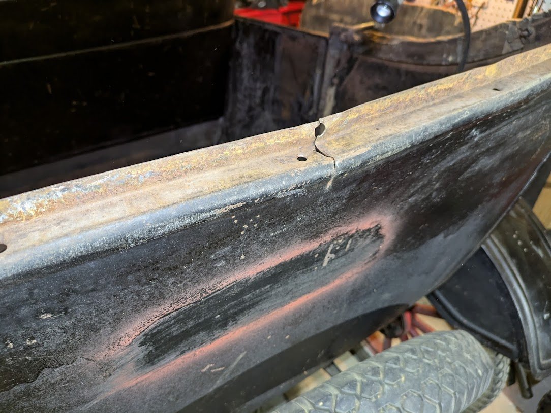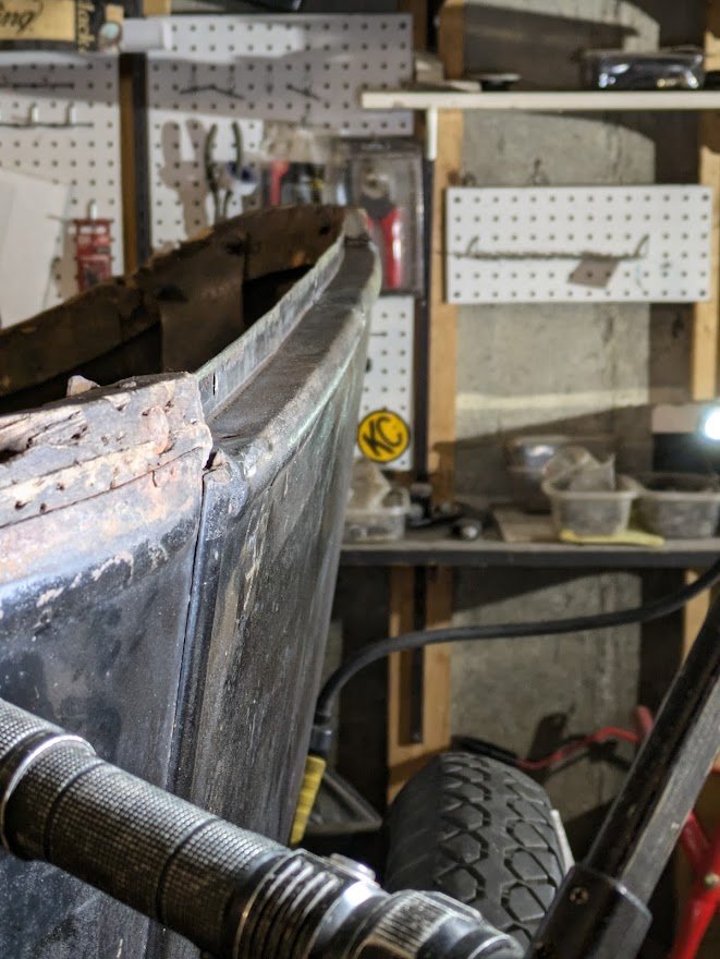 I'm doing a new interior and top for my 25 Touring. On the back panel, there is a break in the center of the panel (see photo) I have since welded the crack but I'm not sure if the back panel should be completely flat where the tack strip goes, or should it have a slight curve. I feel that the back panel of these cars is not exactly flat, thereby requiring the tack strip to curve as well. I'm using the white trim material, plastic?, from the big box store, and will be heating it and curving some pieces.