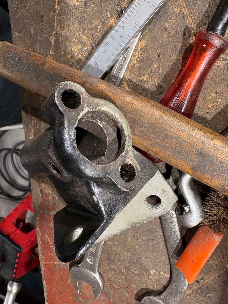 I continued the rebuild today. I tried to enlarge the upper diameter in the bracket to install an upper bushing, but on closer inspection that appears to be impossible, because the hole of the greasecup is 1/4 from the upper edge. So one bushing it will be. Reaming to the correct diameter is much easier, because you don’t have to worry about reaming two bushings in line. Ford was clever