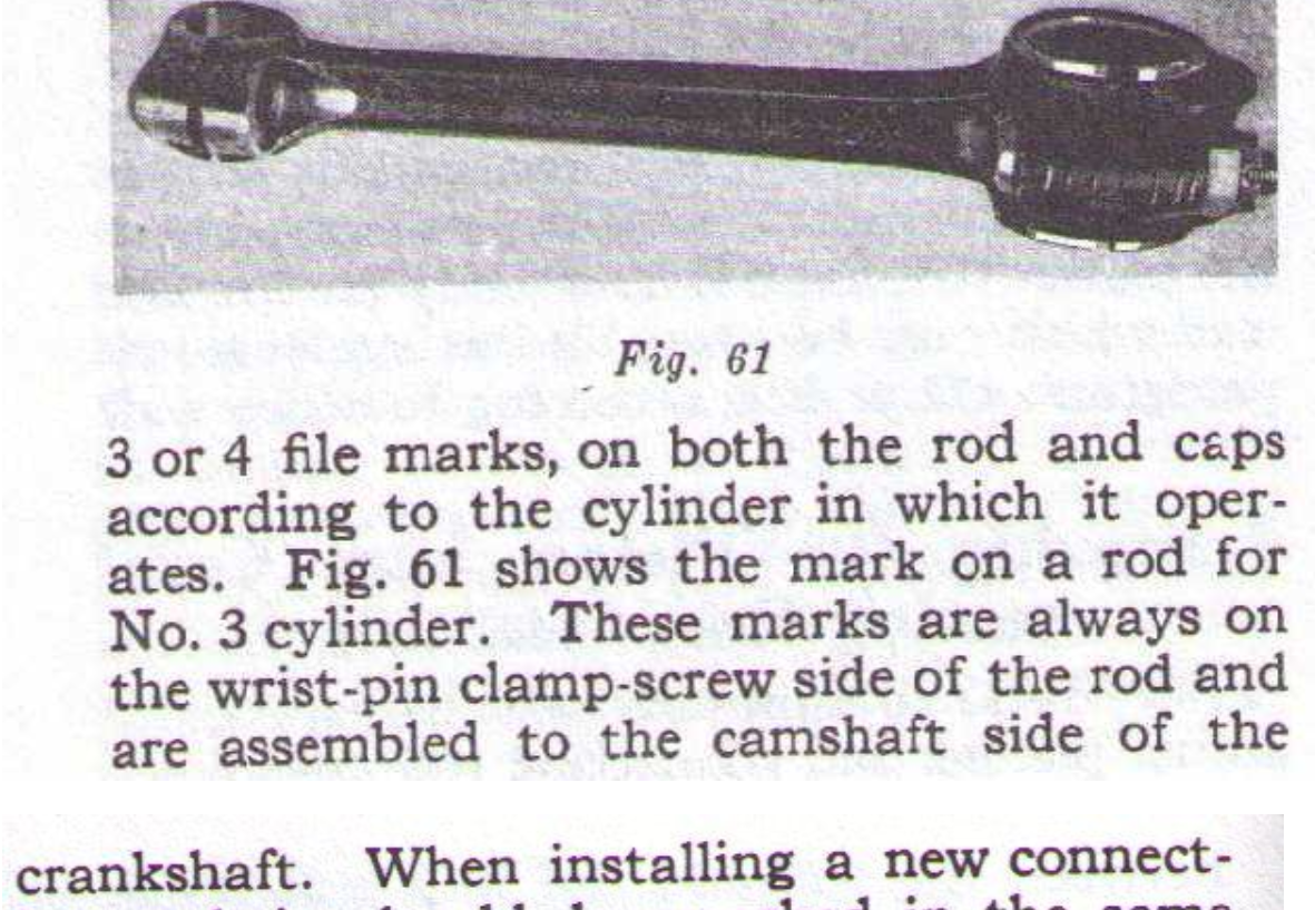 The service book page 98 has after marking a rod, the markings on the rod and cap should be on the same side as the rod clamp screw. Then in the service bulletin volume 1 page 71, Assembling pistons and rods in the motor, the number markings face the camshaft side of the motor.