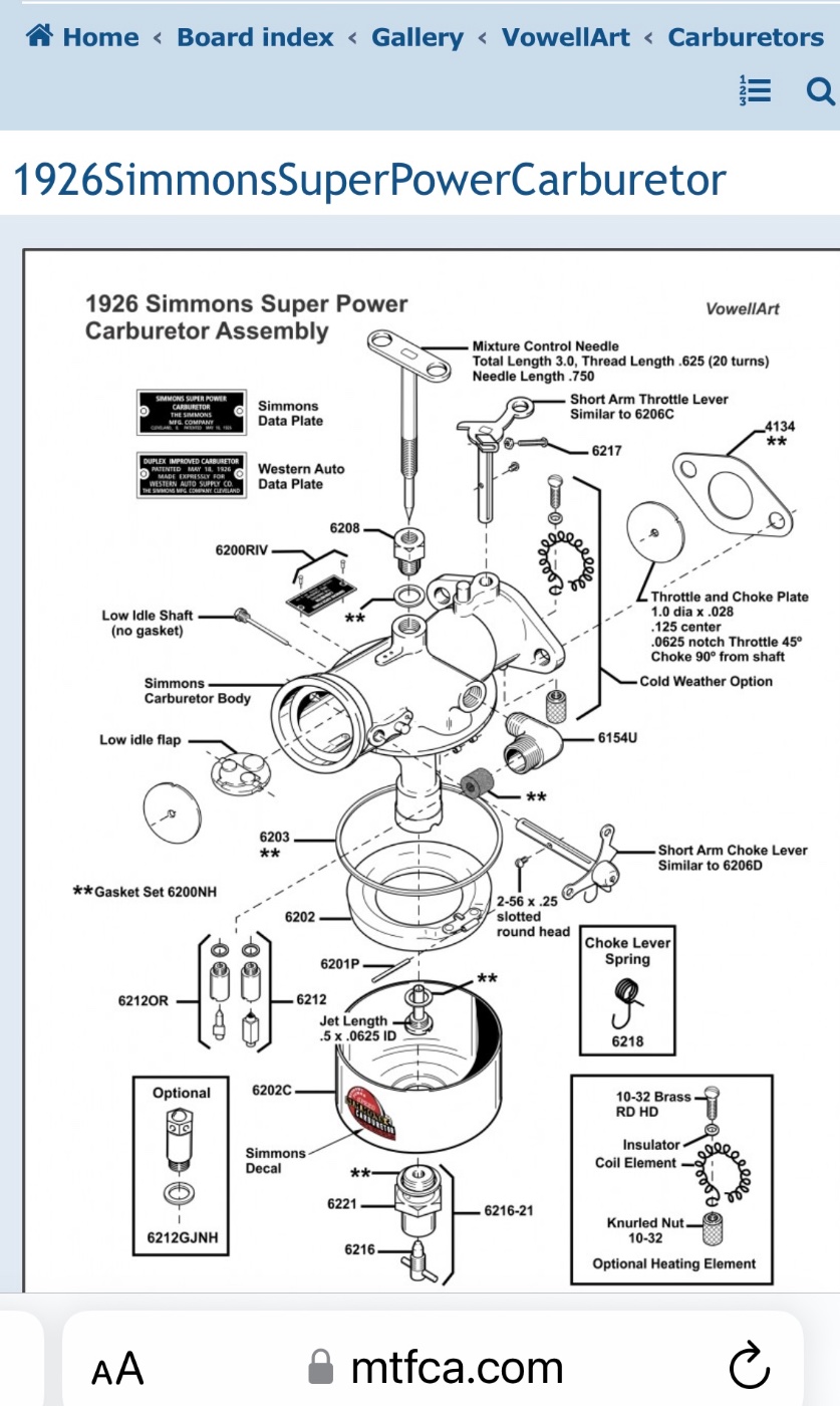 I too would like to see instructions. I have what I’m told is a Simmons carburetor on my ‘24 touring and it runs MIUCH better than either of the two NH’s I have. It gives easy cold starts and consistently gives me 20-21 mpg on tour. The only issue I’ve ever had was that the “low idle flap” stuck closed once, but a healthy squirt of brake cleaner a little light oil solved that problem. I don’t recall for sure whether or not the heater coil is still there, but it’s not been wired up since I’ve had the car.