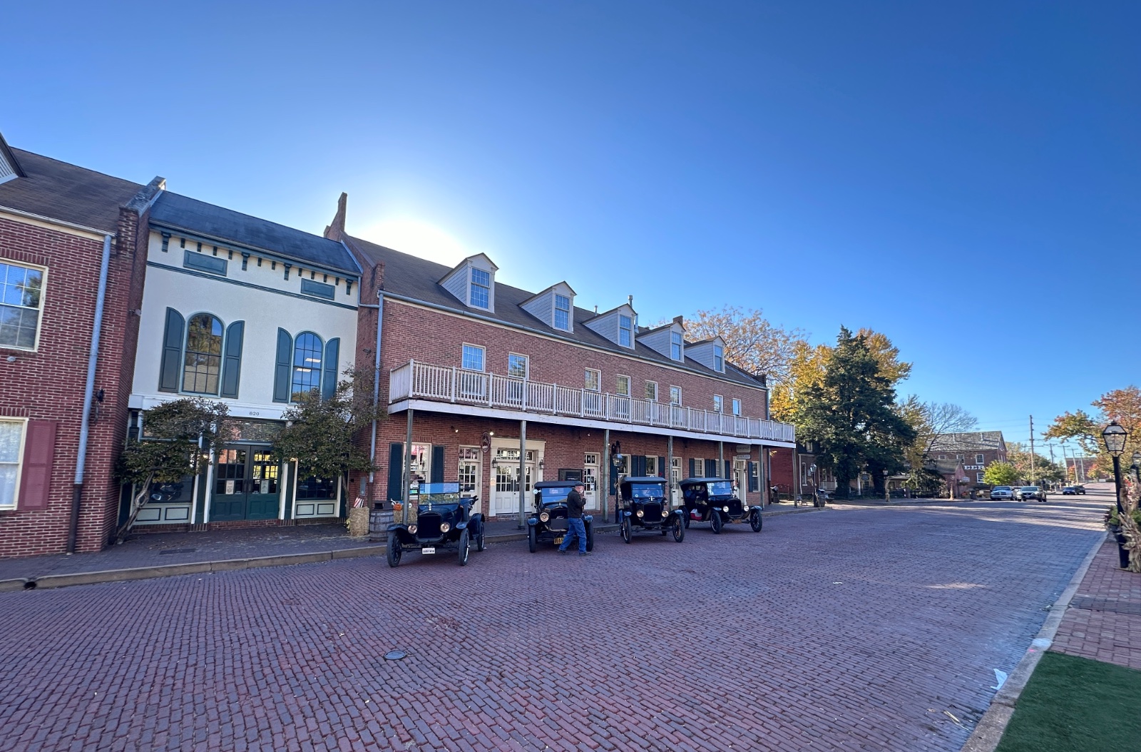 Due to some road closures I was unaware of I got there a few minutes late. We had 4 cars that left a bit after 9 and we headed off to historic St. Charles, Mo. A quick stop and then down the brick street heading towards the ferry. We did stop at Smartt Field, but the hanger was closed and no one around but we looked at the outdoor exhibit of antique military vehicles and chatted with a few bicyclist that happened by. By then the temperature had warmed and the top came down on two of the cars. The ferry crossing was delayed a minute or two due to a large string of barges going upriver.