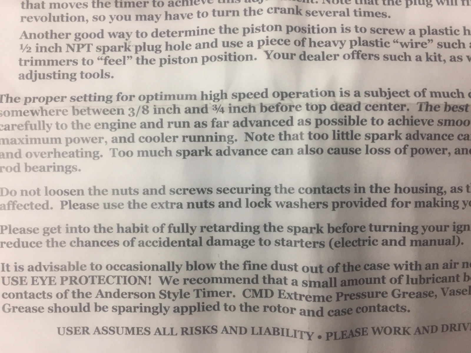 Steve, my technique was definitely different than yours. I just followed what the Anderson Timer paperwork said. It stated to set the spark when the cylinder was past TDC between 1/2" to 3/4". I thought it seemed like a long distance, but I will double check the paperwork, and readjust closer to 15o
