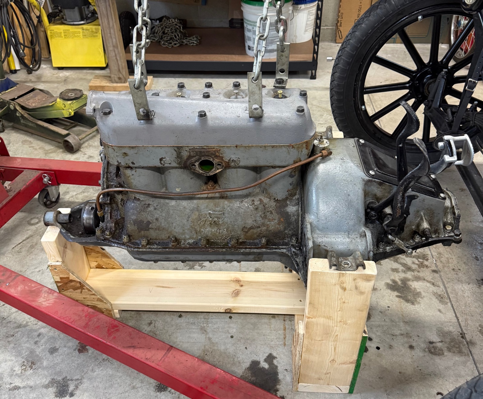 Polished and reinstalled the carburetor adjust rod, carburetor pull and commutator pull rods, found and installed a proper four wire loom, removed and serviced the fan assembly, reinstalled with a leather fan belt, reinstalled radiator, started her up on three quarter pulls and went to supper.