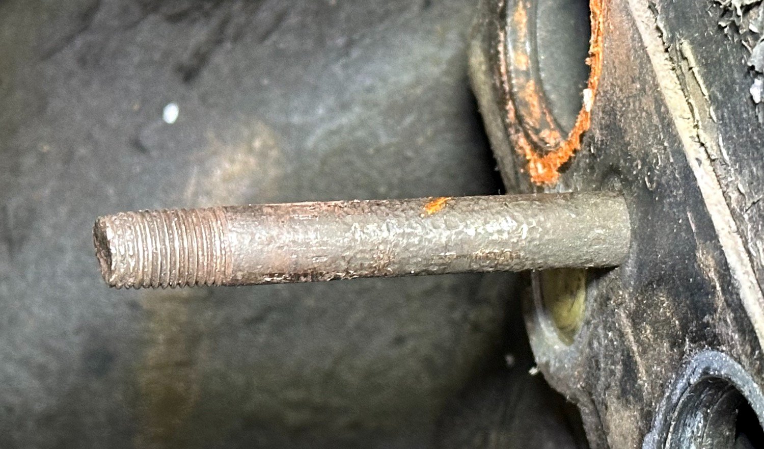 The problem came when tightening the nuts on the studs. The first three were good, the rear nut stripped the threads off the stud. All of these studs were short to my mind previously, see bottom picture to see how they were when I started. I like to see the stud sticking out past the nut, none of these did. In addition to being short, the stud in back had been cut at the factory at an angle so in addition to being short it had a partial amount of threads on the all important end. This morning I measured the studs, that back one was the shortest of the four.