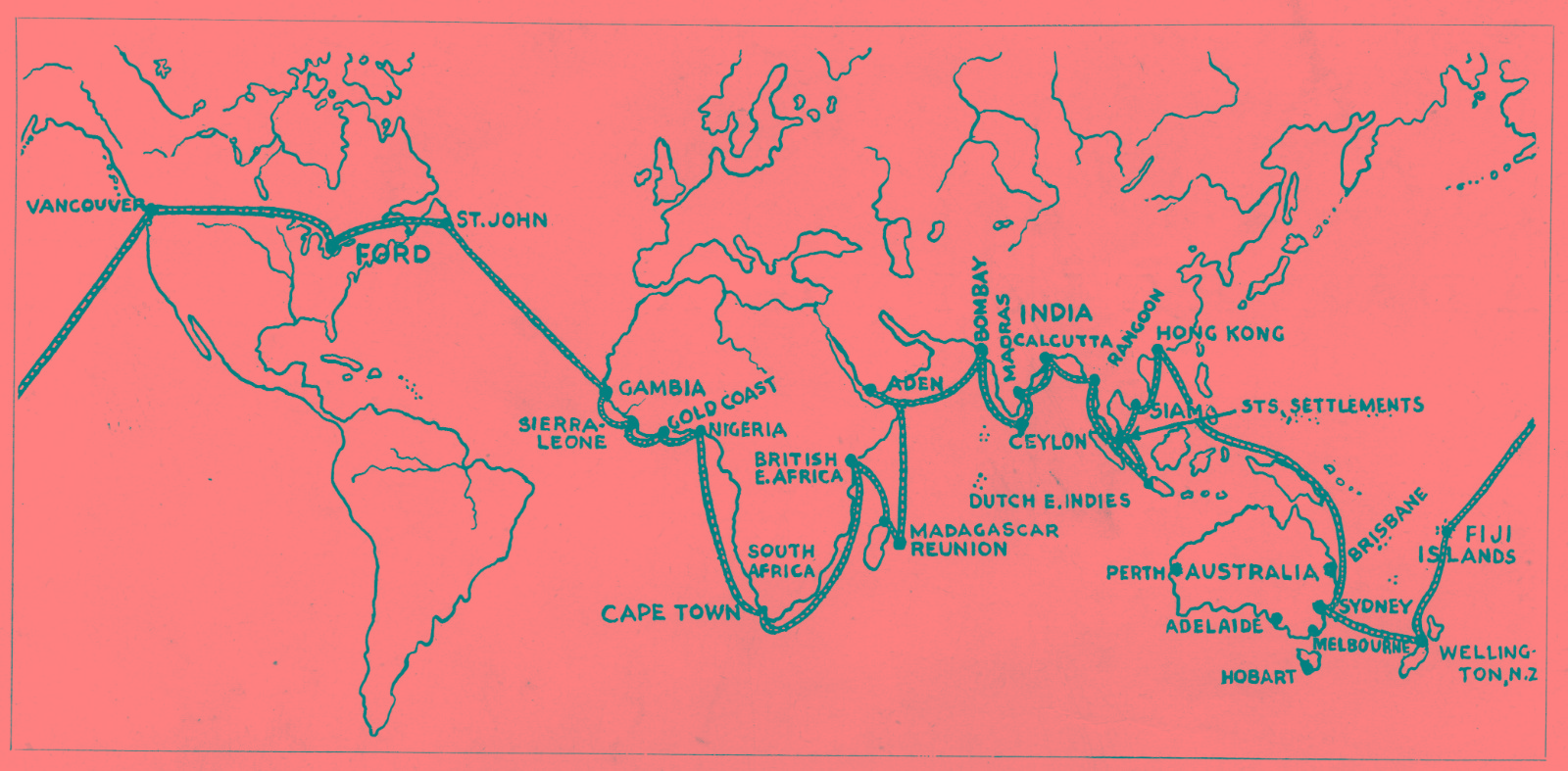Wayne, For you here is a bit of info. Ford Canada printed this sketch showing the routes used to ship Fords overseas in the 1920's . Most Canadian Fords left from Ontario Canada and went east mostly to New York and then onto the British Colonies. Those going west to Vancouver and onto Fiji and New Zealand and then to Australia was an option only used when problems arose such as during WW1 when the eastward route was jammed up because of the war.