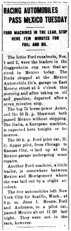 Steve, I'll sheepishly admit I wasn't previously familiar with Mary Margaret McBride, so thanks for cluing me in! Looks like she was actually from Paris, Mo., but did a pre-radio stint out of college at the Mexico Ledger, in Mexico, Mo. (The Ledger gave the race good coverage when it came through!)