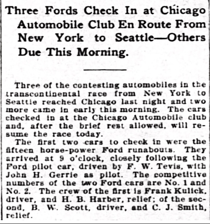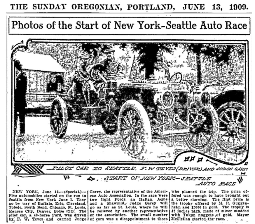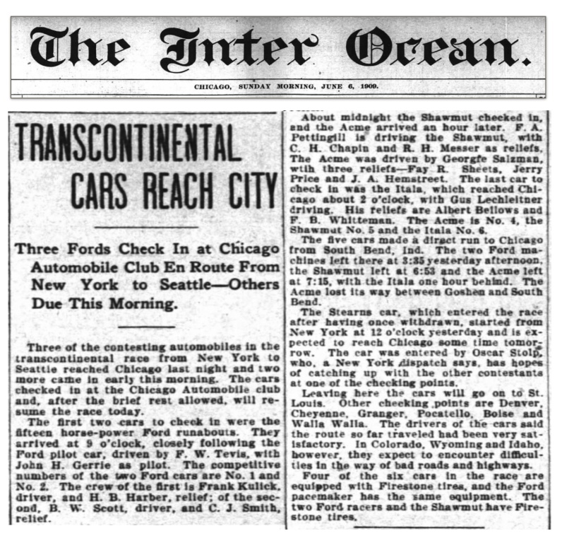 In the course of research, I've gathered up as many 1909 news clips as I could find (from hundreds of local and national newspapers, trade publications, and other sources) and tracked down more than 50 descendants of people involved in the race in one fashion or another, including relatives from all six crews (the two Fords, the Shawmut, the Acme, the Itala ... and the Stearns, which started late and only got as far as Tarrytown, NY) and several of Ford's corporate branch managers, who served as "fixers" in every sense of the word (arranging to have dealers and agents in their territory serve as expert local guides for the Model Ts, publicizing the Ford entries to the local press, and engaging in tactics that the Ford team deemed savvy "generalship," though the ACA officials who ruled in favor of Shawmut's appeal would later take a dimmer view).