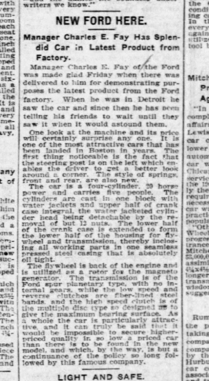 That's been repeated in other histories of the race since, and it appears to be the first place it was introduced in writing. I wish I knew where they got that from! Perhaps it was some internal passed-down detail, or noted in some document or clipping that doesn't survive today in the BFRC file. But the broken connecting rod seems to be consistent with the Shawmut telegram about the Ford's having a broken "piston" and with Cruikshank's memory of unspecified engine trouble.