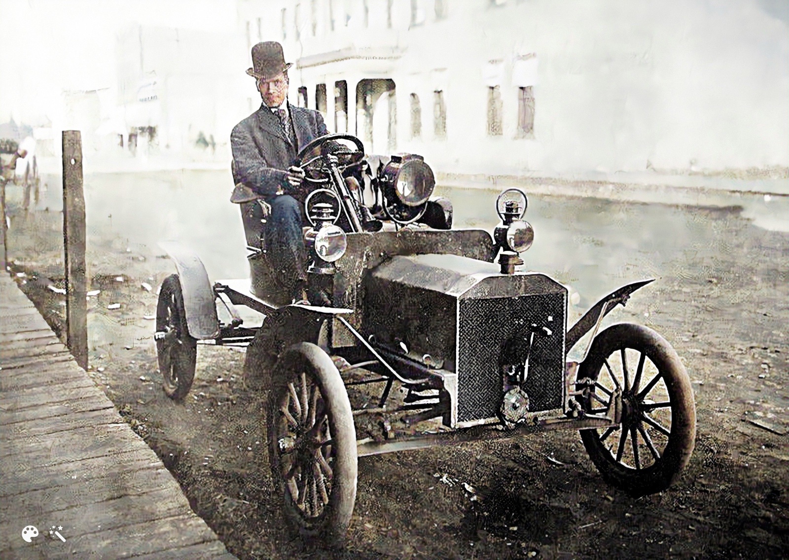 Photo number five. Is that an early model N Ford? The seat appears to be more narrow than most Ns, an early model N detail. The man's coat tail appears to be hanging over the seat in such a way that the "buggy rail" for the optional top cannot be seen. Is that an early style radiator neck?