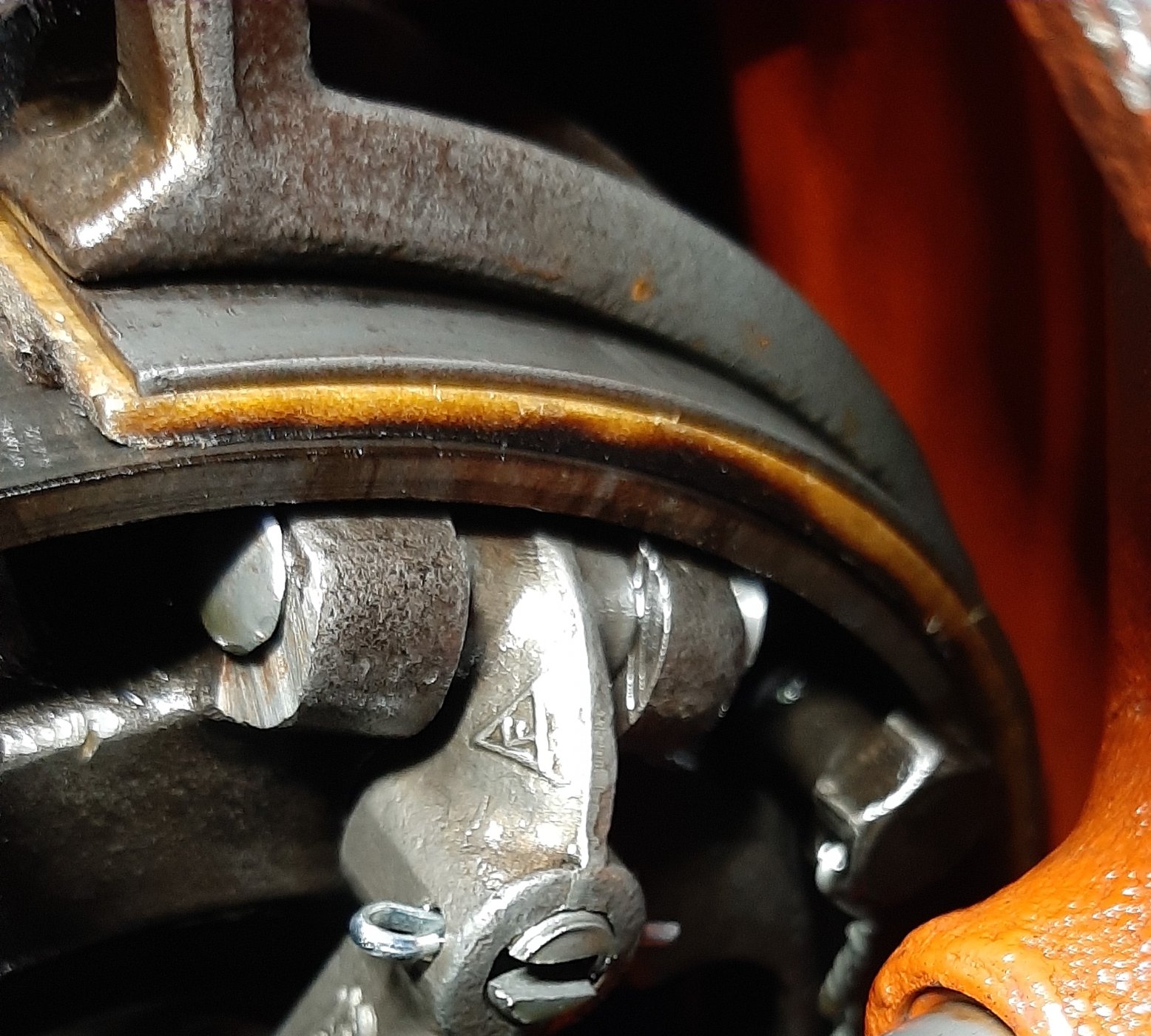 After inspecting the linings I can see the brake lining is scorched and there is some non-metallic material in the filter screen which was not found during the previous brake adjustments (pictures attached), so now for the questions: