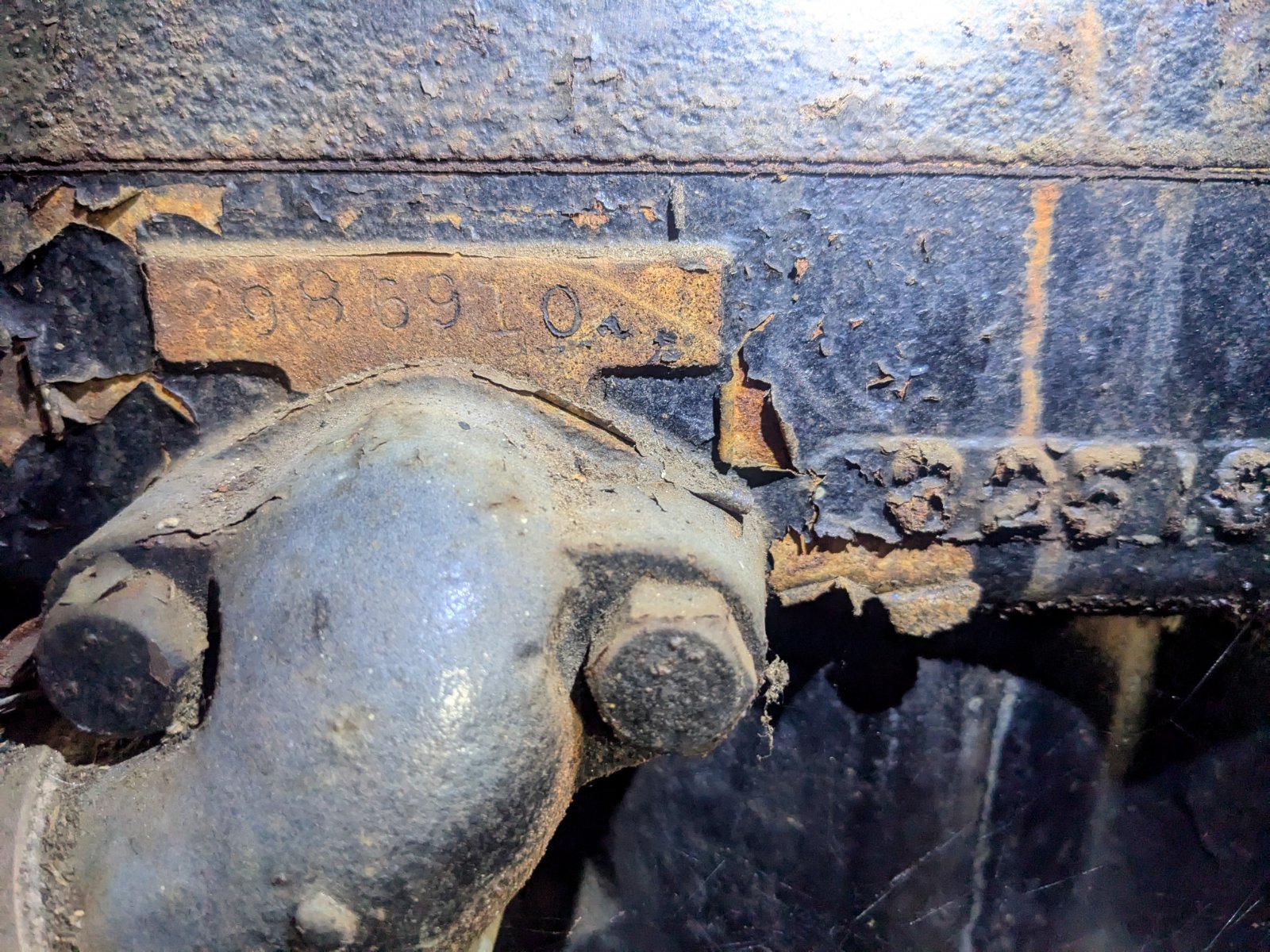 As for the engine number, we weren't quite sure which one it was. Per the comments, it seems it's the 29869102? one which is unreadable towards the end. The family always said it was a 1918 but per the encyclopedia, it looks to be a 1919 with that number. Does anyone have tips on deducing the last digits? Or advice on totally not destroying the number stamping since it's in already poor condition?