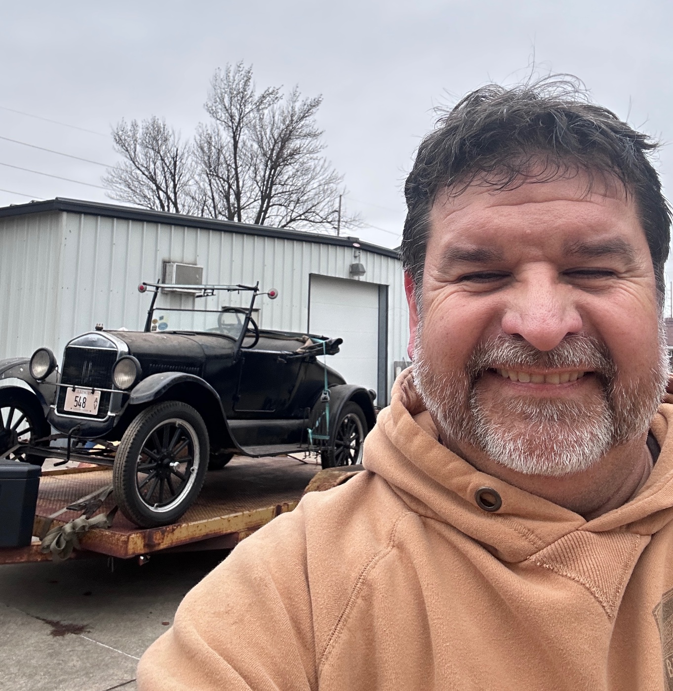 This aluminum body 1909 touring followed me home from Kansas in a snowstorm in February 2019. I had just been released by the doctor to drive again after a round of pneumonia so it was a rough trip for me. I then fell off the trailer and landed flat on my back while cranking the T to drive it off the trailer. I had removed all the lights and floors and seat bottoms and anything else not tied down for the trip.